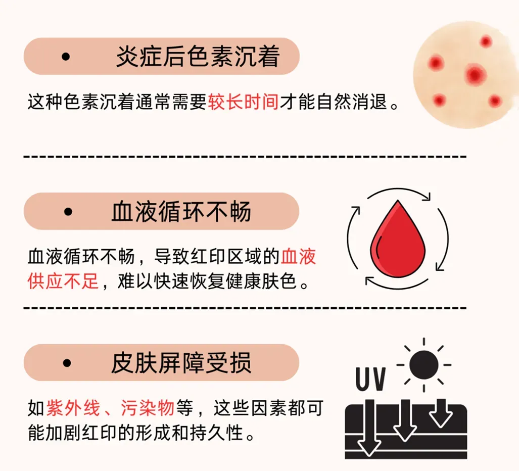 色沉风险期:若红印长期未消退,紫外线刺激或反复摩擦会激活黑色素细胞,导致红印变黑。