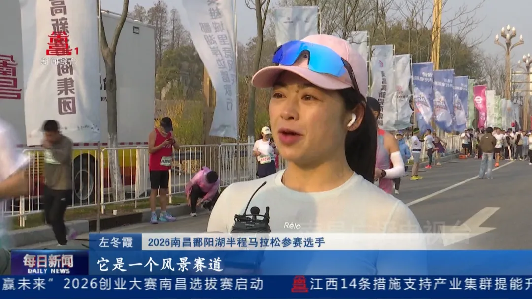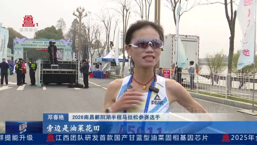 2026南昌鄱阳湖半程马拉松参赛选手邓春艳:“这个赛道我现在是第三次跑了,旁边是油菜花田,经过一个白鹤区,然后13公里下来就是沿着两边樟树林,一路下来其实挺顺的,周围的观众太热情了,坚持跑下来了。”