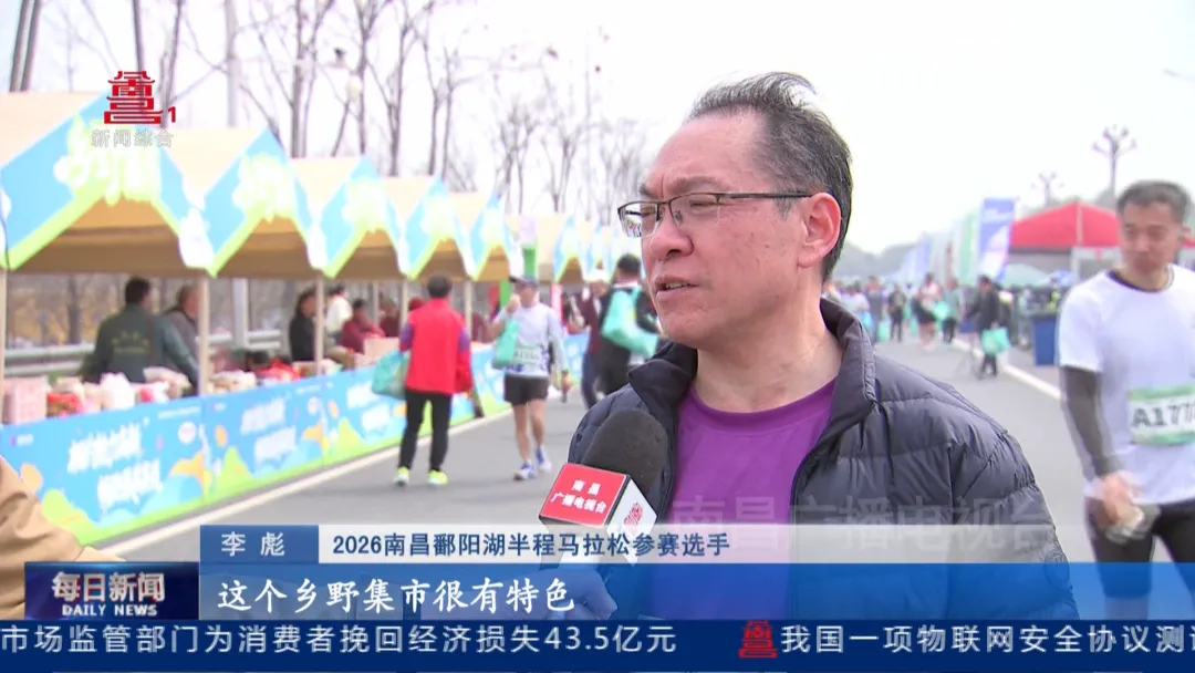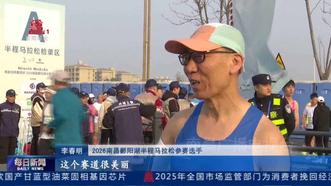 2026南昌鄱阳湖半程马拉松参赛选手李春明:“我从哈尔滨来,好多年都想到这里来看一看。这个赛道很美丽,所以说很向往,十里香樟树,还有大片的油菜花海,这都是很有吸引力的。”