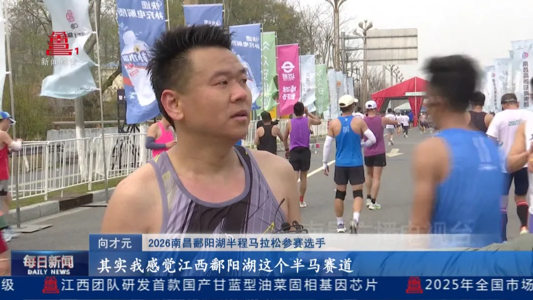 2026南昌鄱阳湖半程马拉松参赛选手向才元:“我来自湖南怀化,其实我感觉江西鄱阳湖这个半马赛道,就是适合PB(刷新个人最好成绩),我也是第二次参加你们江西这个半马,然后就是这次PB(刷新个人最好成绩)了18分钟。赛道风景很美,沿着这个鄱阳湖,还有两边的树林,还有油菜花,给人感觉跑下来,全程很轻松的感觉。”