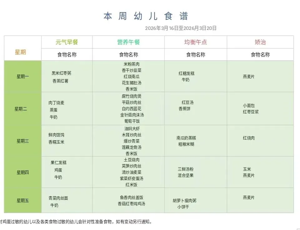 3、因天气、地域等不可抗因素,会出现蔬菜、水果等原材料采购不到的问题,可能出现变更食谱现象,敬请家长朋友们理解