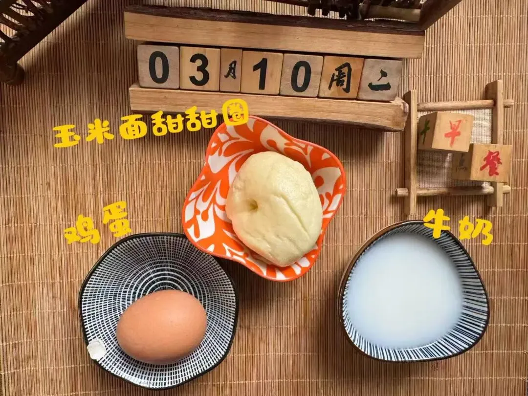 玉米面甜甜圈、鸡蛋、牛奶