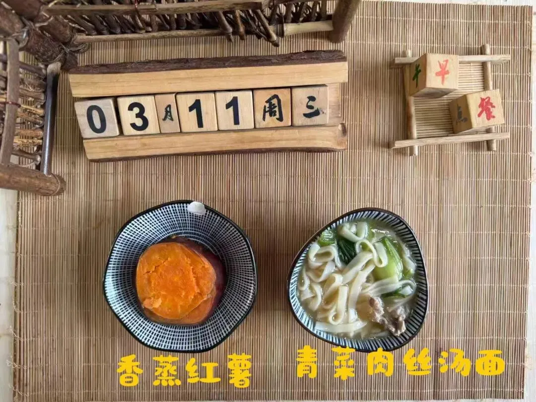 青菜肉丝汤面、香蒸红薯