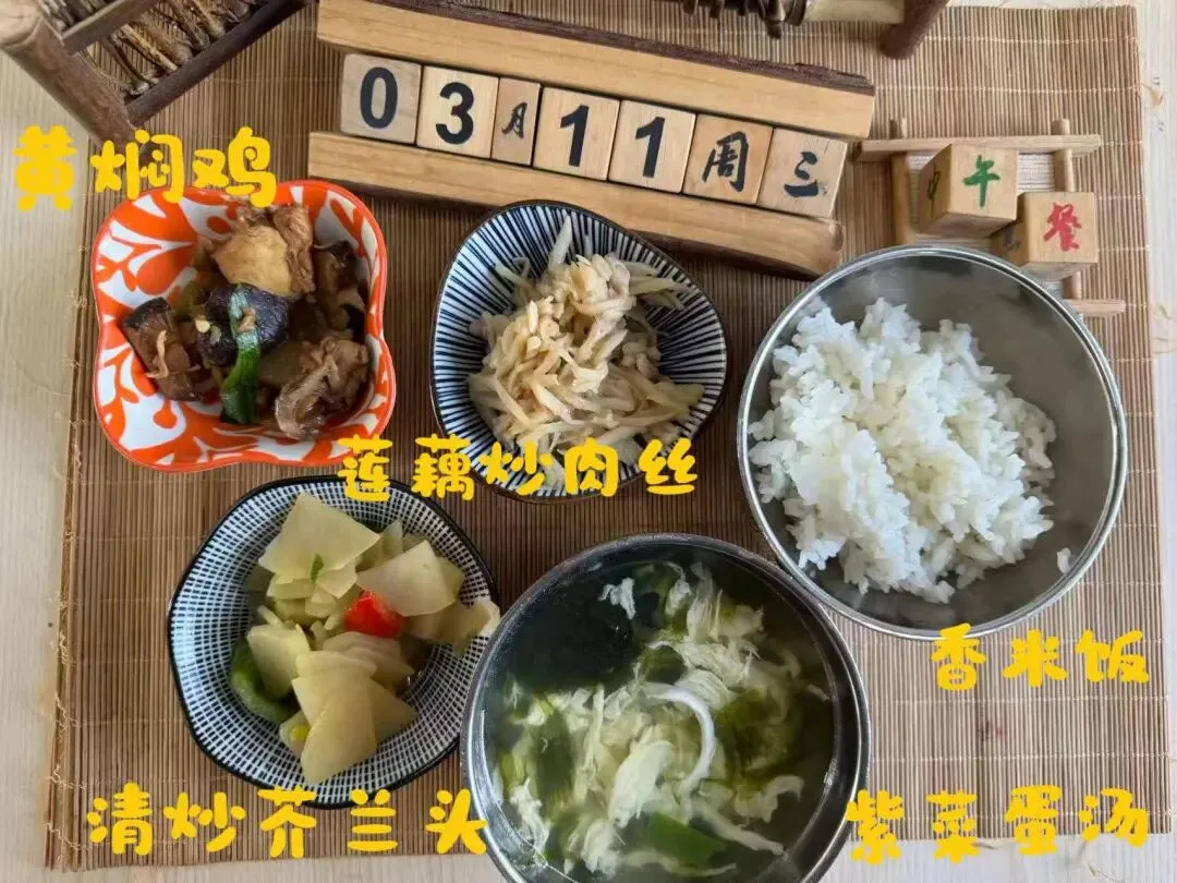 黄焖鸡、莲藕炒肉丝、清炒芥兰头、紫菜蛋汤