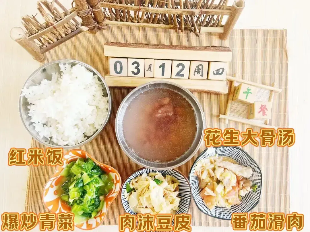 番茄滑肉、肉沫豆皮、爆炒青菜、花生大骨汤