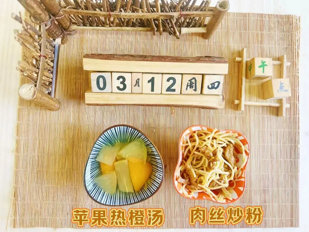 肉丝炒粉、苹果热橙汤