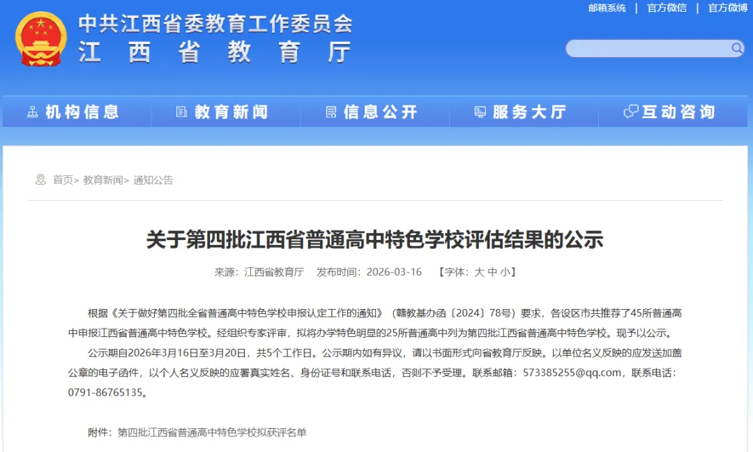 公示期自2026年3月16日至3月20日,共5个工作日。公示期内如有异议,请以书面形式向省教育厅反映。以单位名义反映的应发送加盖公章的电子函件,以个人名义反映的应署真实姓名、身份证号和联系电话,否则不予受理。