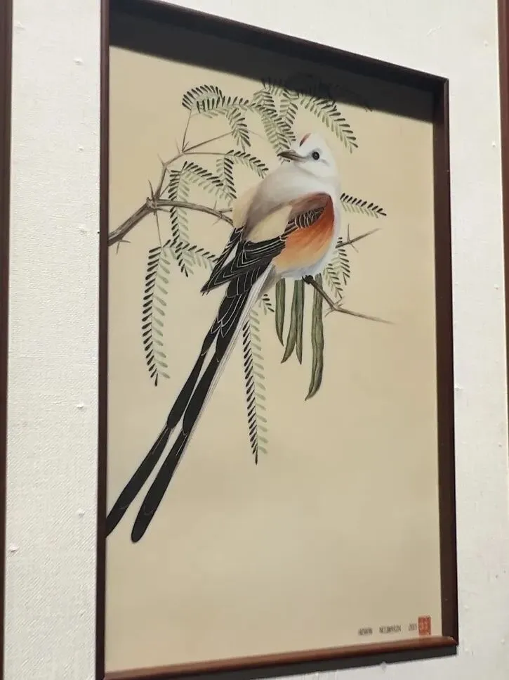 更有几笔勾勒的花鸟,长尾鸟停在枝桠上,羽毛的层次、叶片的脉络都活灵活现,还有振翅欲飞的小鸟,连翅膀扇动的力道都能从画里感受到。