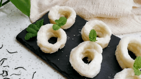 这道小吃真是第一次见也是第一次吃,应该是用糯米粉制作的,外表是诱人的雪白色,略略炸过后沾了一层厚厚的糖粉,形状有点儿像几个“北京焦圈儿”叠在一起,口感软糯香甜,有点儿像在武汉吃到的“酥饺”。