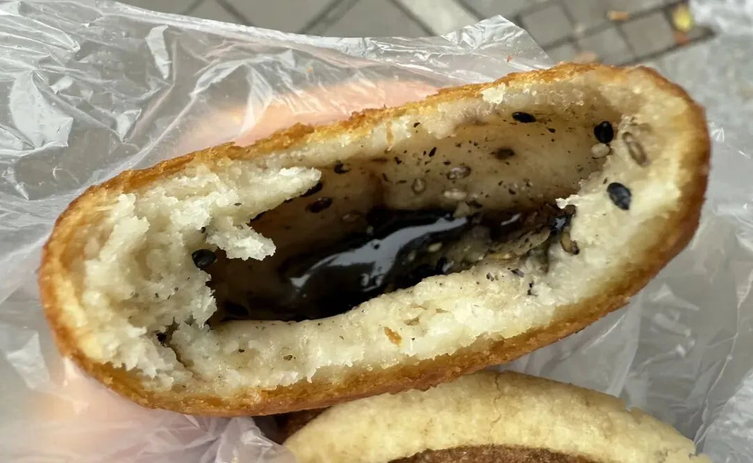 里面的馅料是白糖和黑芝麻,刚炸出来整体呈流动状,外皮也是一层层泡泡,又酥又脆。