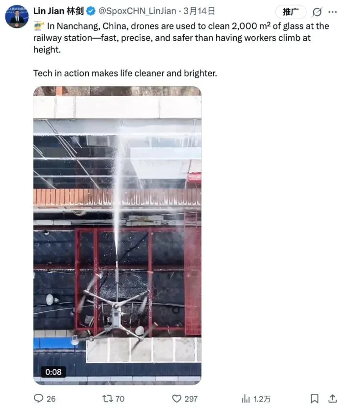 3月14日,外交部发言人林剑在海外社交平台发布专属视频,向世界推介南昌站无人机高空清洁站房玻璃的创新应用,称赞这一举措“速度快、精度高,而且比让工人攀高作业更安全”,直言“科技让生活更洁净、更明亮”。