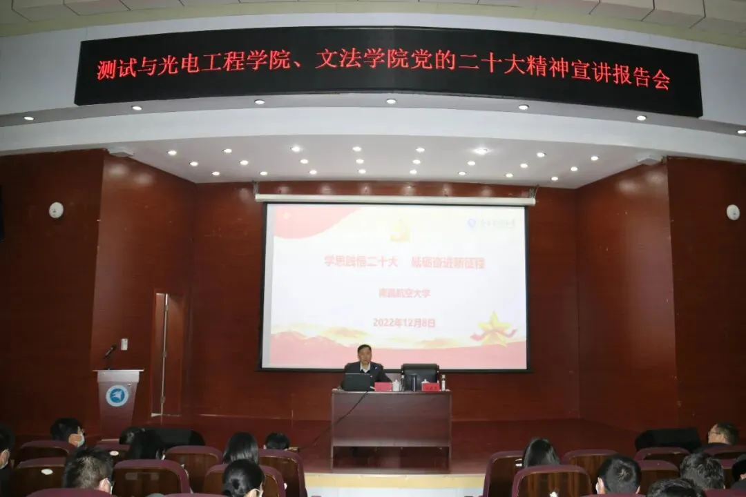 校长卢超为联系学院宣讲党的二十大精神党委书记罗嗣海在为全校处级领导干部、基层党支部书记宣讲时强调,要对照学校党的二十大精神宣讲相关部署,出台专门文件,学习好、宣传好、贯彻好党的二十大精神,切实用党的二十大精神武装头脑、指导实践、推动工作,在全面建设社会主义现代化江西中展现南航更大担当、更大作为;各宣讲团成员要做到用朴素的语言、感人的事例,让宣讲报告场场精彩生动。校长卢超在联系学院宣讲时强调,全体师生要充分认识学习宣传贯彻党的二十大精神的重大意义,深刻领会党的二十大报告的精神实质和丰富内涵,努力成为党的二十大精神的学习者、宣传者和践行者,用党的二十大精神武装头脑、推动工作,让党的创新理论内化于心、外化于形,在全面建设社会主义现代化江西中展现南航风采。其他校领导也分赴各自联系的学院和单位开展宣讲,通过报告引导广大师生把思想和行动统一到党的二十大精神上来,在全面建设社会主义现代化江西中展现南航更大担当、更大作为。