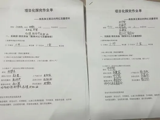 学生走进万寿宫商圈与百花洲周边开展双店实地调研。各小组按分工开展实践,分别记录排队时长、出餐效率、客流量等数据,观察制作工艺、对比口感酱料,手持项目化探究作业单规范记录,从多维度完成双店对比,锤炼综合实践能力。
