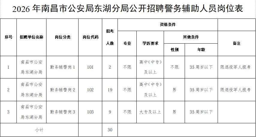 (二)招聘岗位:此次员额制辅警招聘共设3个岗位,详见《2026年南昌市公安局东湖分局公开招聘警务辅助人员岗位表》。