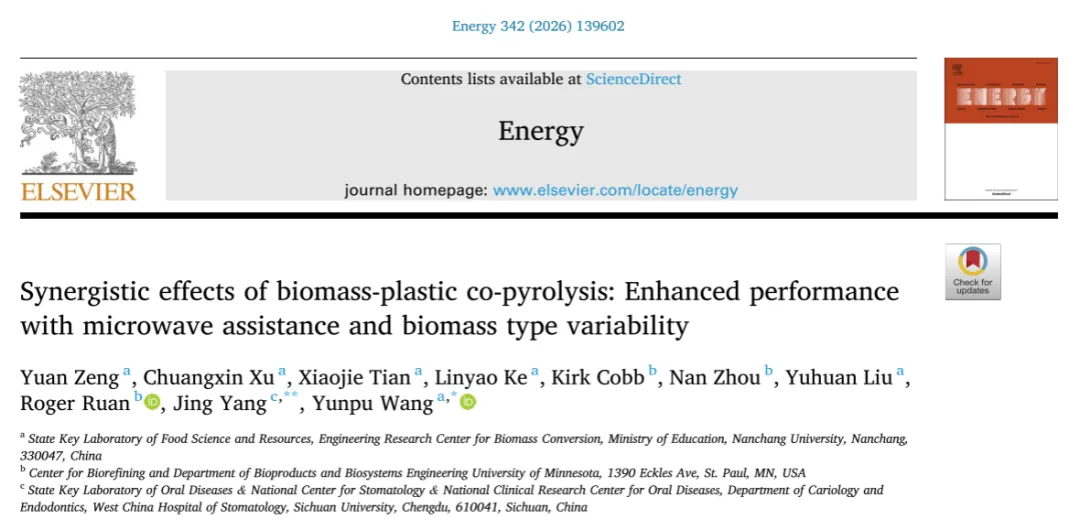 本文来自南昌大学王允圃教授团队,发表于《Energy》期刊,本文聚焦生物质与塑料共热解技术,针对微波在协同效应强化中的作用及生物质异质性对协同作用的影响两大研究空白,通过对比微波热解与传统热解系统,结合 5 种不同生物质(南酸枣内果皮 CAE、稻草 RS、油茶壳 COS、甘蔗渣 Baga、玉米芯 Corn)与低密度聚乙烯(LDPE)的共热解实验,系统探究了加热方式、生物质类型对热解产物分布、协同效应强度及催化剂结焦行为的影响。研究揭示了微波快速加热通过缩小生物质与塑料的分解时间差增强协同作用,明确了木质素含量是调控协同抑焦效果的关键因素,提出木质素衍生物的氢转移反应是协同效应的核心内在机制,为固体废弃物的高效资源化利用提供了理论支撑与技术参考。