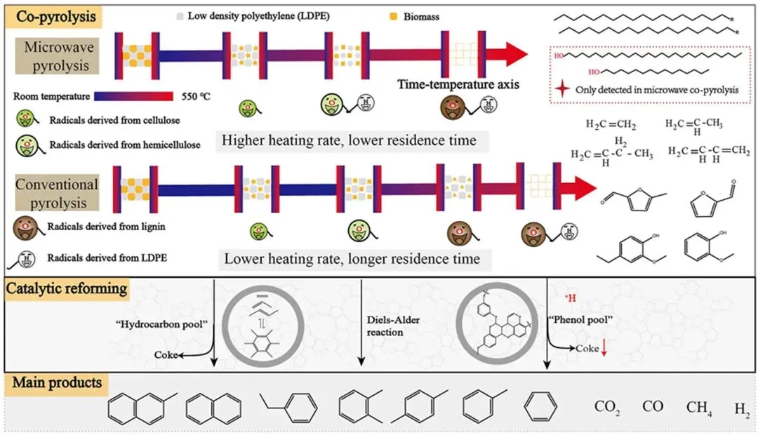 本文通过系统对比微波与传统热解系统,结合不同类型生物质与 LDPE 的共热解实验,明确了加热方式、生物质组成对共热解协同效应的调控规律。核心结论包括:微波加热通过快速升温促进挥发分同步释放,强化氢转移反应,显著提升目标芳香烃选择性并降低能耗;生物质木质素含量是协同抑焦的关键调控因子,高木质素生物质与塑料的协同效果更优;共热解协同效应的核心机制为氢转移反应,而非 Diels-Alder 反应,分共热解与催化重整两阶段发挥作用。