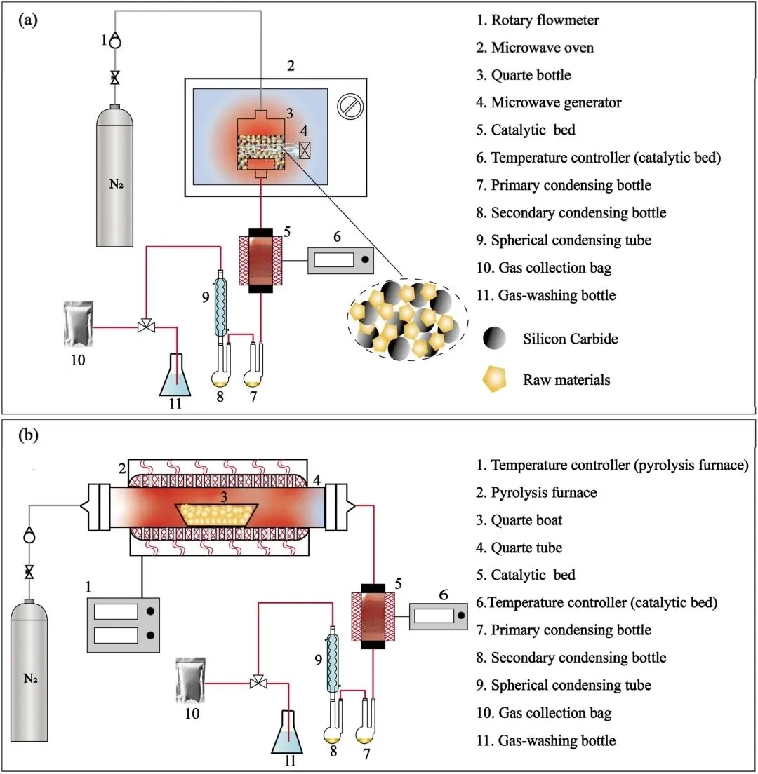 (b)传统热解装置:以电加热炉替代微波发生器,虽升温快(1-2 min 达目标温度),但因气体传热慢,总反应时间延长至 60 min,装置差异直接导致加热效率与产物分布不同