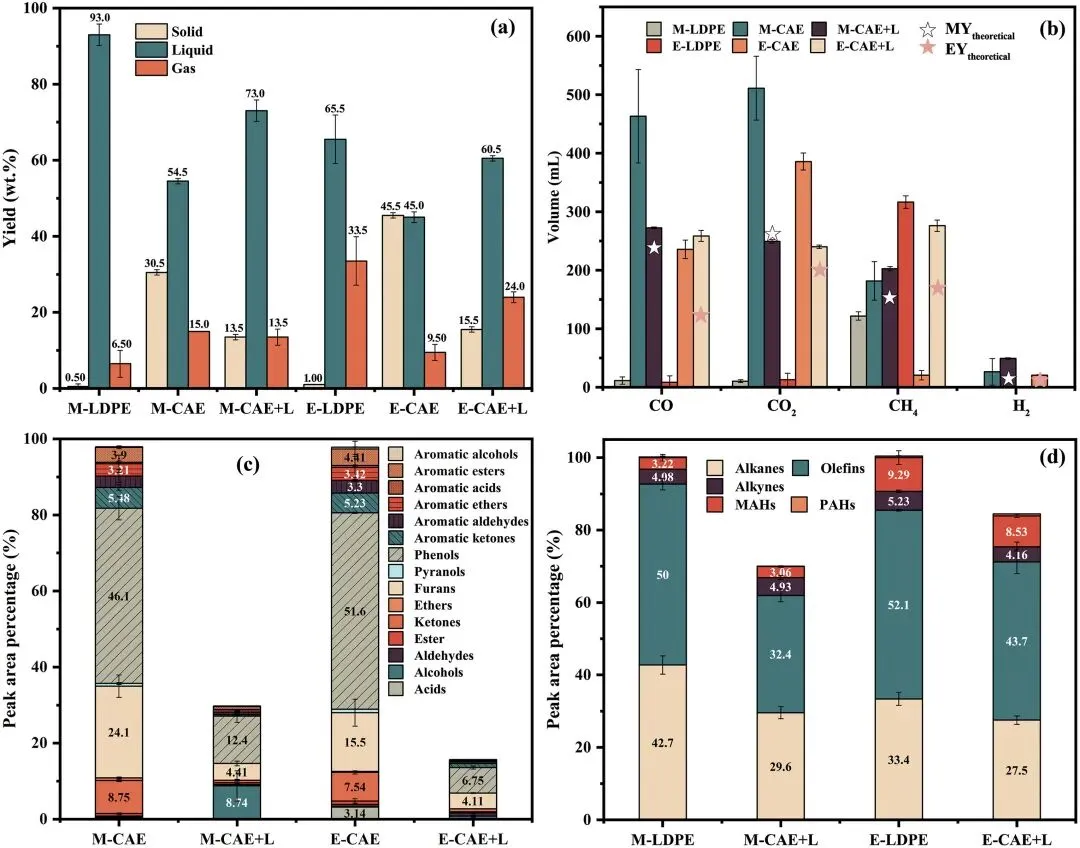 (c)液体产物组成:烃类占比接近 100%,CAE 与 LDPE 共热解的 MAHs 占比最高(83.4%),协同效应最优。
