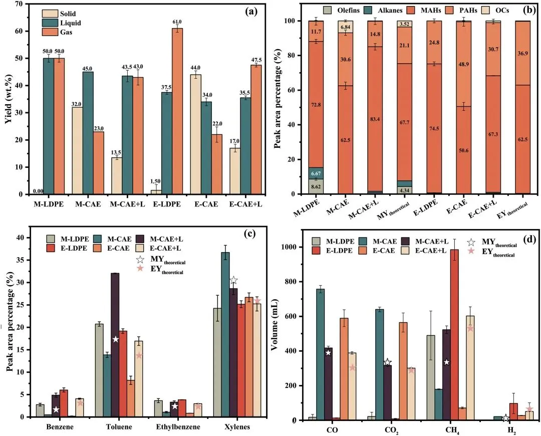(c)芳香烃组分分布:微波促进甲苯、二甲苯生成,CAE 与 LDPE 微波催化共热解中苯、甲苯的实验值接近理论值的 2 倍,协同效应显著。