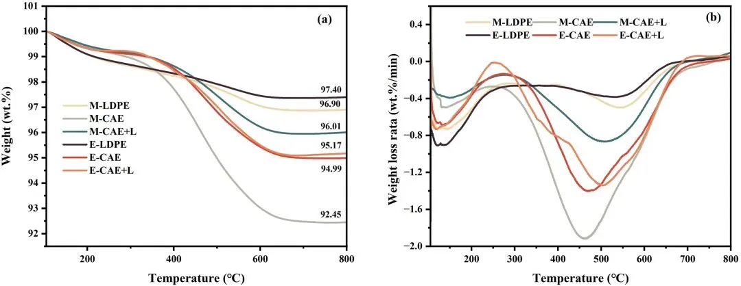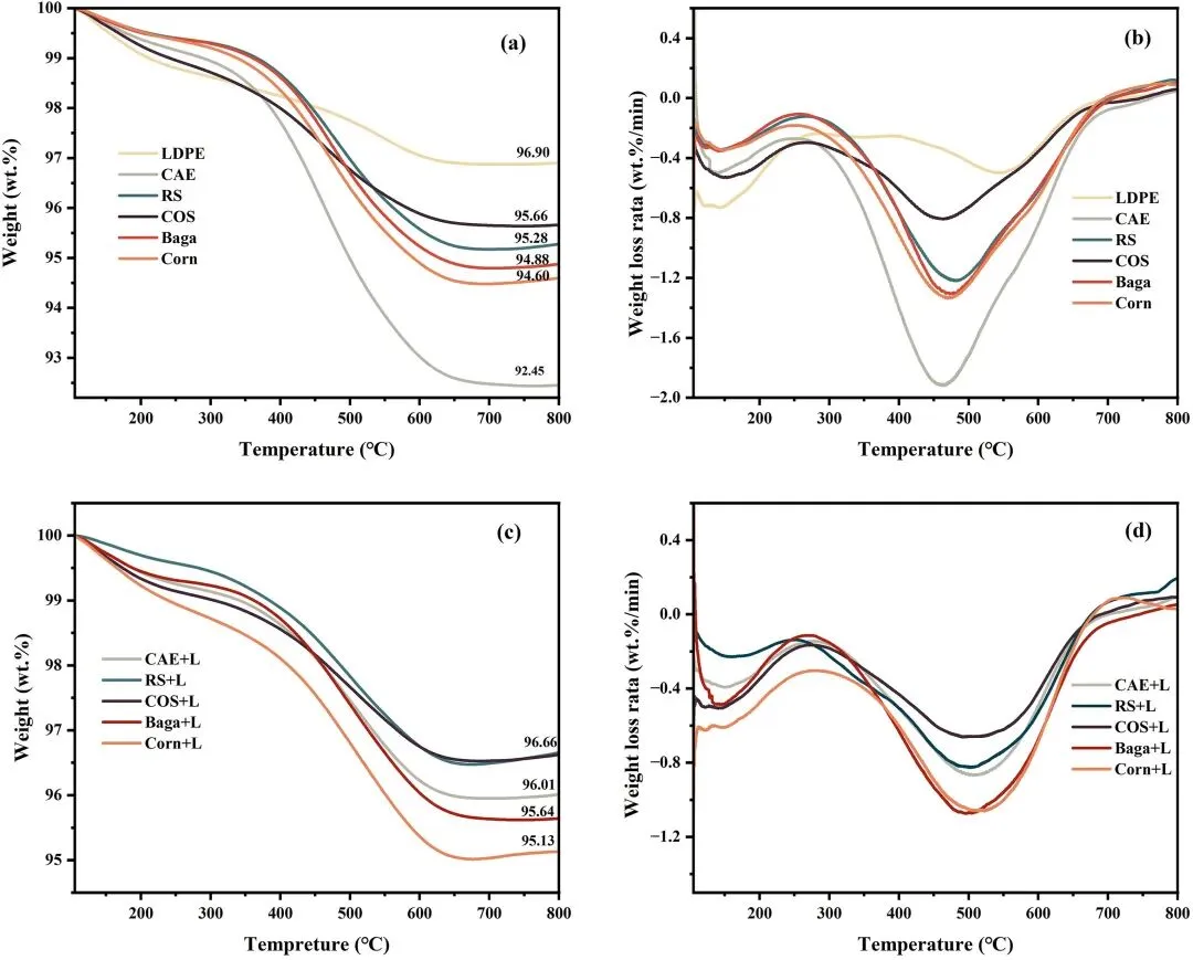 (b)DTG 曲线:结焦失重分为两阶段 ——105-268℃(吸附水与物理吸附物脱附)、268-700℃(焦炭燃烧),焦炭热稳定性顺序为:生物质热解<共热解<LDPE 热解,且热解系统不影响焦炭组成。