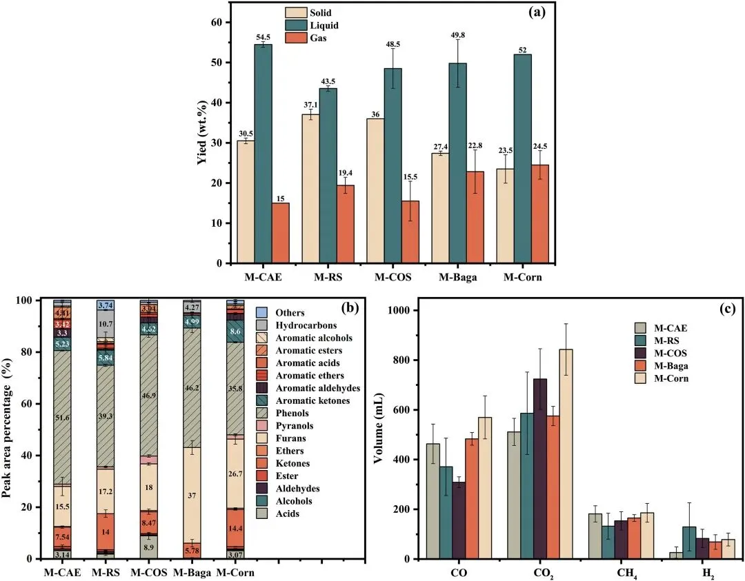 (a)三相产率:稻草(RS)固体产率最高(37.1 wt%),玉米芯(Corn)最低(23.5 wt%),固体产物主要为灰分与生物炭。