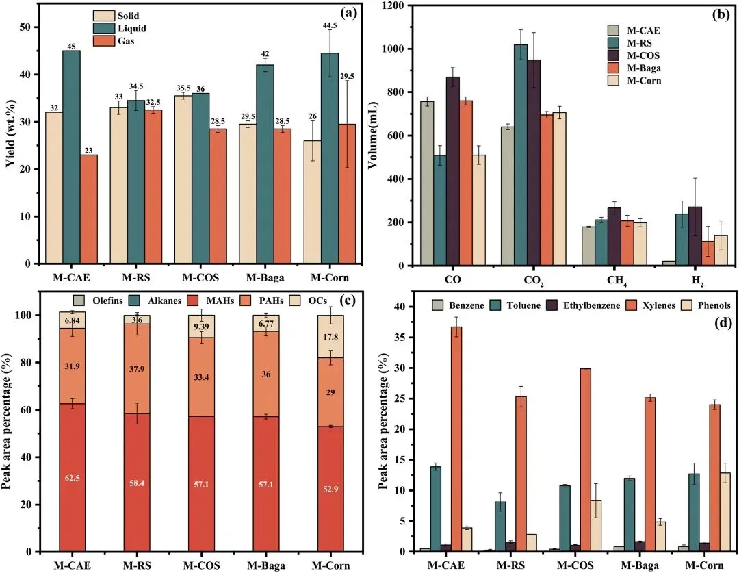 (a)产物产率:微波共热解(M-CAE+L)的液体产物产率高于单独生物质热解,且固体产物少于传统热解,表明共热解与微波加热均利于液体产物生成。