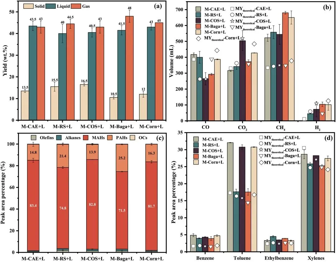 (d)芳香烃组分分布:甲苯、二甲苯为主要产物,CAE、COS、Corn 与 LDPE 共热解对目标芳香烃的选择性更高。