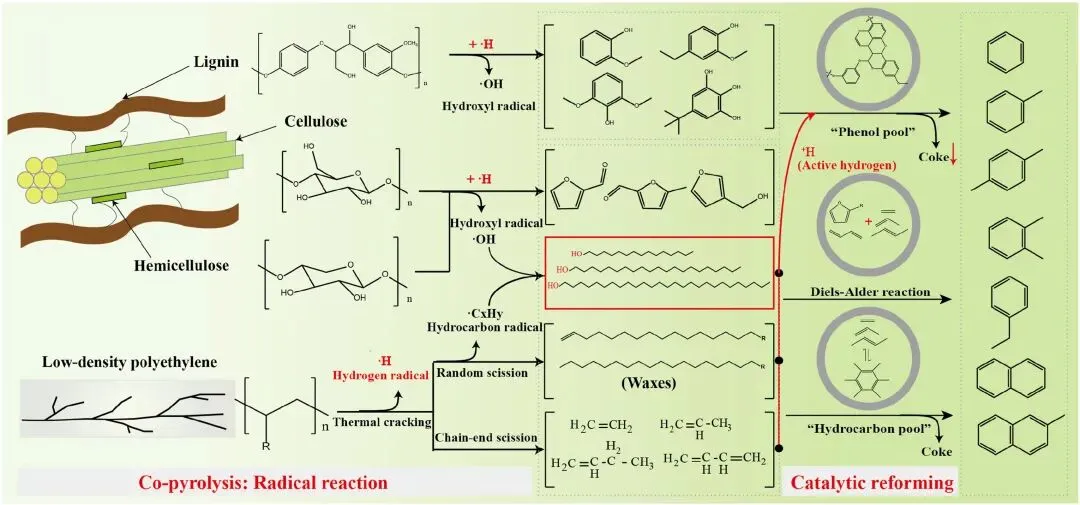 3.揭示协同效应核心机制:提出共热解协同效应的核心并非传统认为的 Diels-Alder 反应,而是木质素衍生物与塑料自由基间的氢转移反应,且明确共热解分两阶段发挥作用:共热解阶段通过自由基相互作用生成特征产物(如长链伯醇),催化重整阶段通过 ZSM-5 催化剂的 “酚池”“烃池” 机制转化为芳香烃。