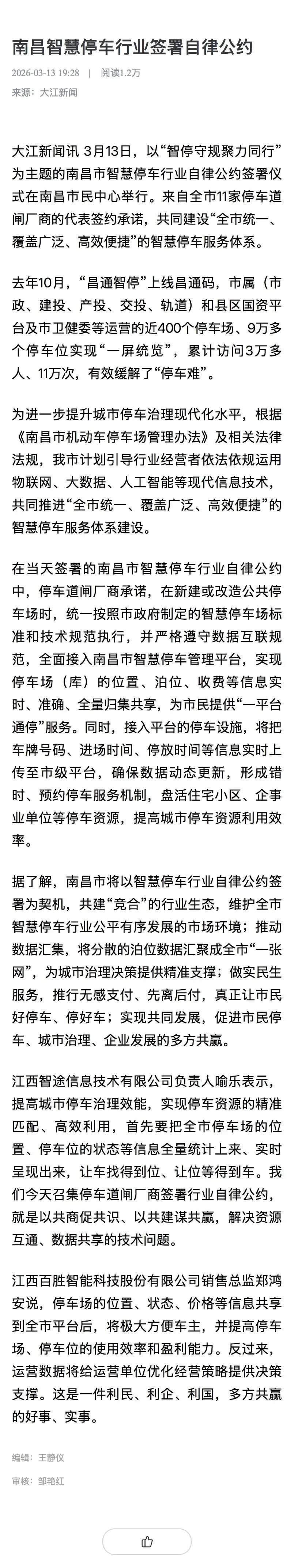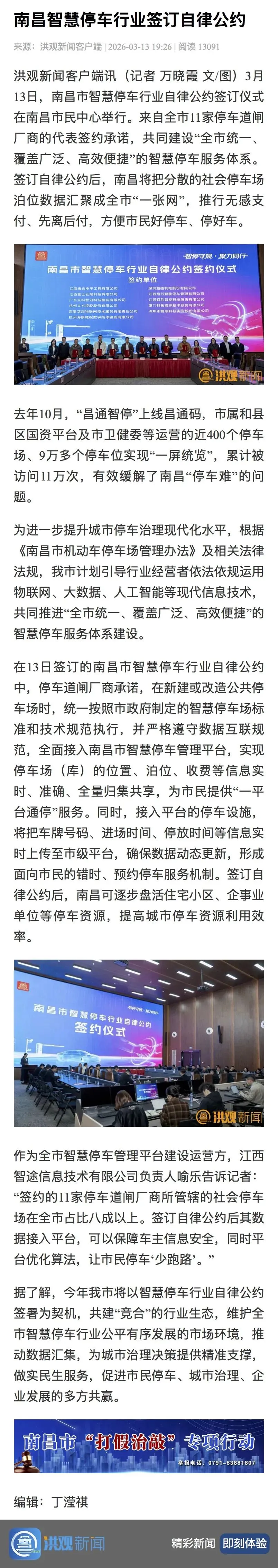 3月13日,以“智停守规 聚力同行”为主题的南昌市智慧停车行业自律公约签署仪式在南昌市民中心举行。来自全市11家停车道闸厂商的代表签约承诺,共同建设“全市统一、覆盖广泛、高效便捷”的智慧停车服务体系。