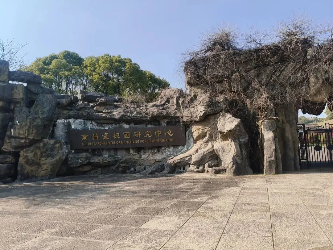 从抖音平台,得知南昌红谷滩处有一处“南昌中国傩园”,经过百度地图查寻与导航,我骑行约18公里,来到红角洲的卧龙山,即丰和南大道520号,在假山造型的大门左侧,横匾式招牌赫然醒目:“南昌瓷板画研究中心”。