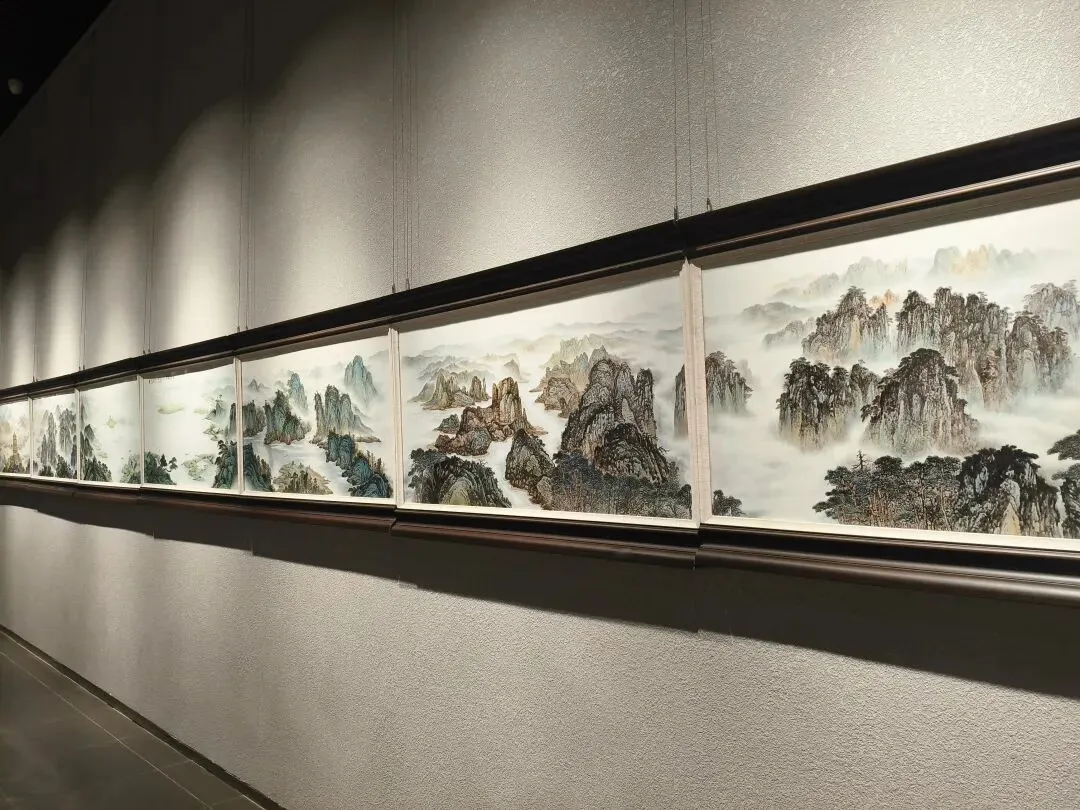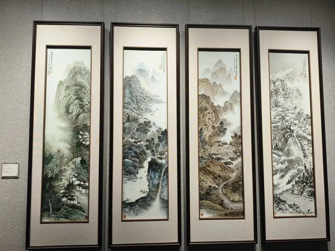 在展厅内,两边墙壁和中间立柱上,分别看到孙中山夫妇、傈僳族老人、各种服饰女人等全身瓷板画,还有核潜艇之父黄旭华、卫星之父孙国栋、全国优秀教师张桂梅、全国脱贫攻坚楷模夏森、航天英雄聂海胜、王亚平等瓷板肖像。在缓步观赏时,我除了喜欢“黄洋界保卫战”、“豫章风情”、娄妃读书、作画、梳妆、小憩画外,我尤其还喜欢一组王维的“空山不见人,但闻人语响”、“江流天地外,山色有无中”,柳宗元的“千山鸟飞绝,万径人踪灭”和孟浩然的“绿树村边合,青山郭外斜”的美仑美奂的诗意山水画面。展柜中,还有雕刻与绘画瓷瓶和绘画用的小楷、针笔、料铲、瓷用各色颜料等。