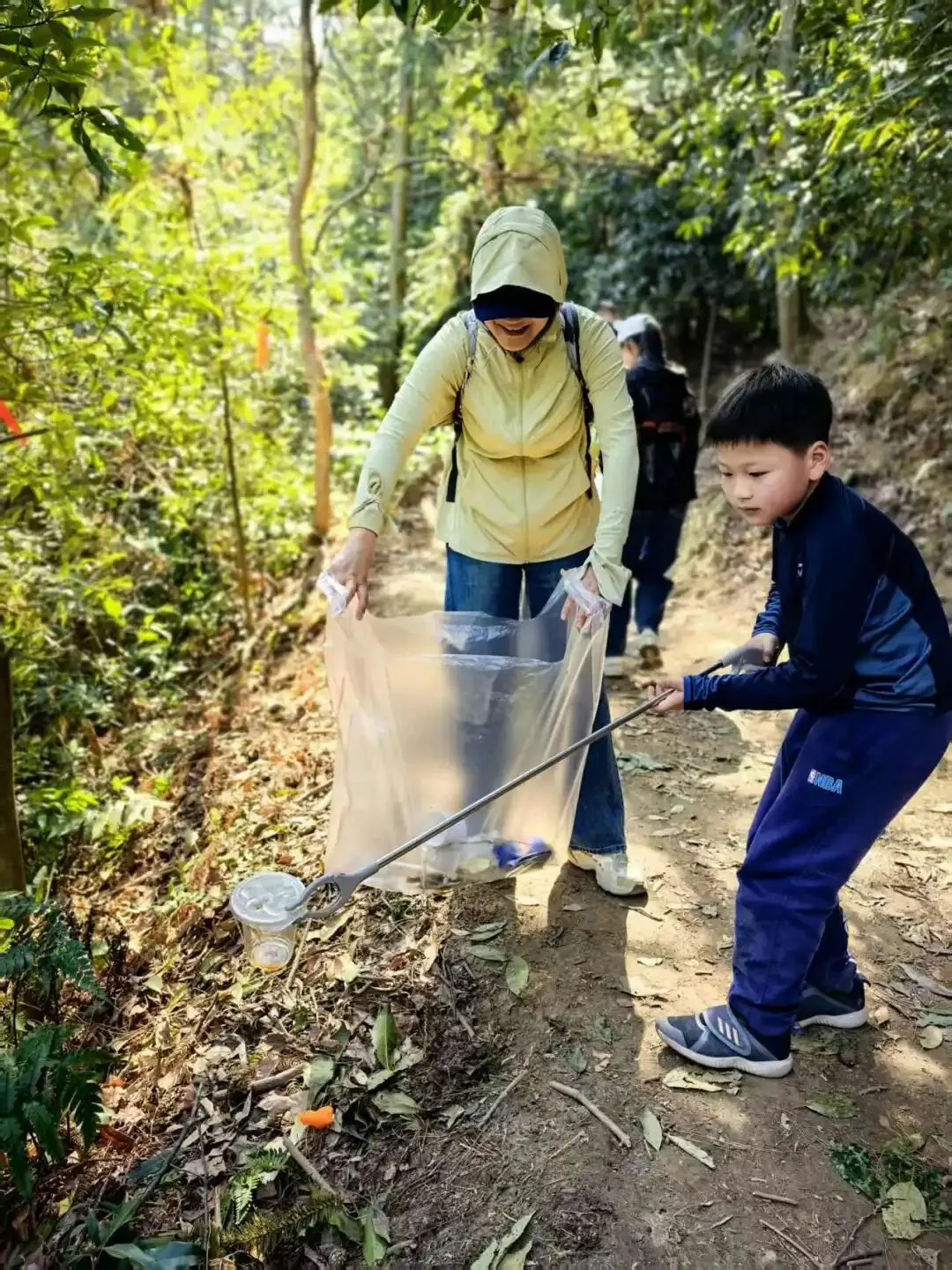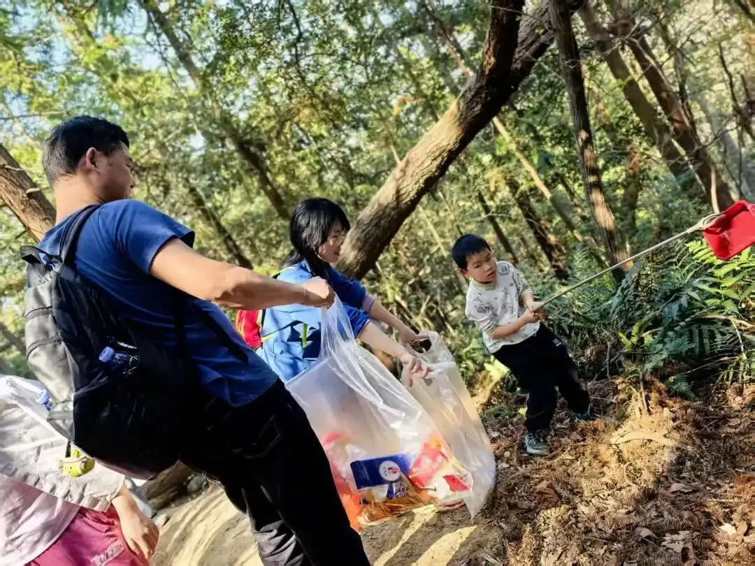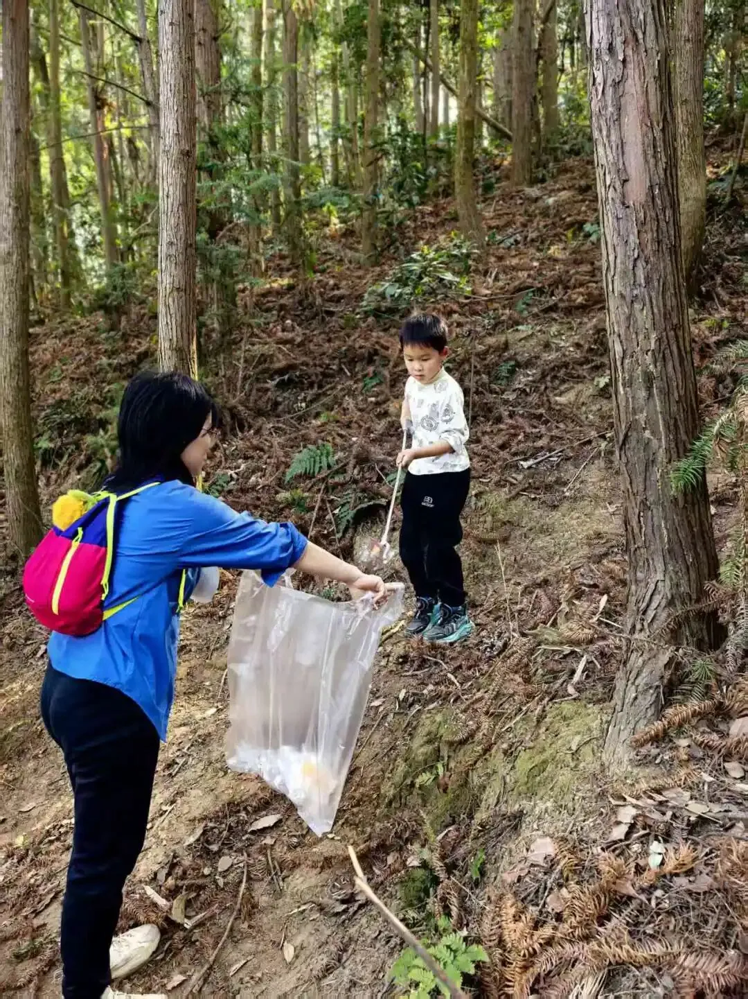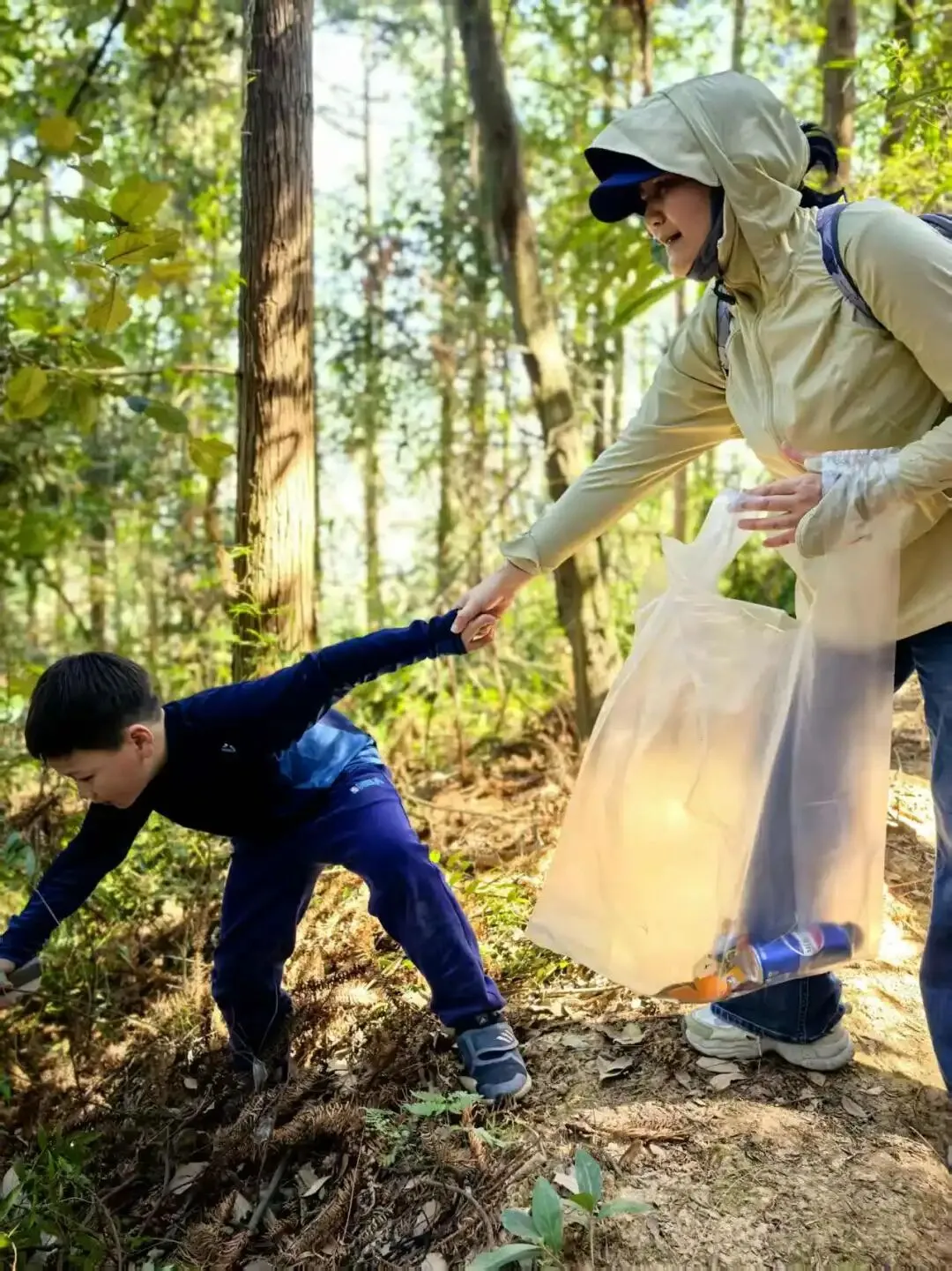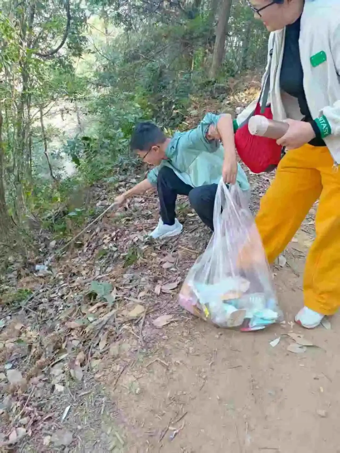 温侠:“今天东梅岭亲子徒步净山:4组家庭走完全程13公里(5个小时),拾获2袋垃圾和约100个瓶子(卖了5.5元)。”