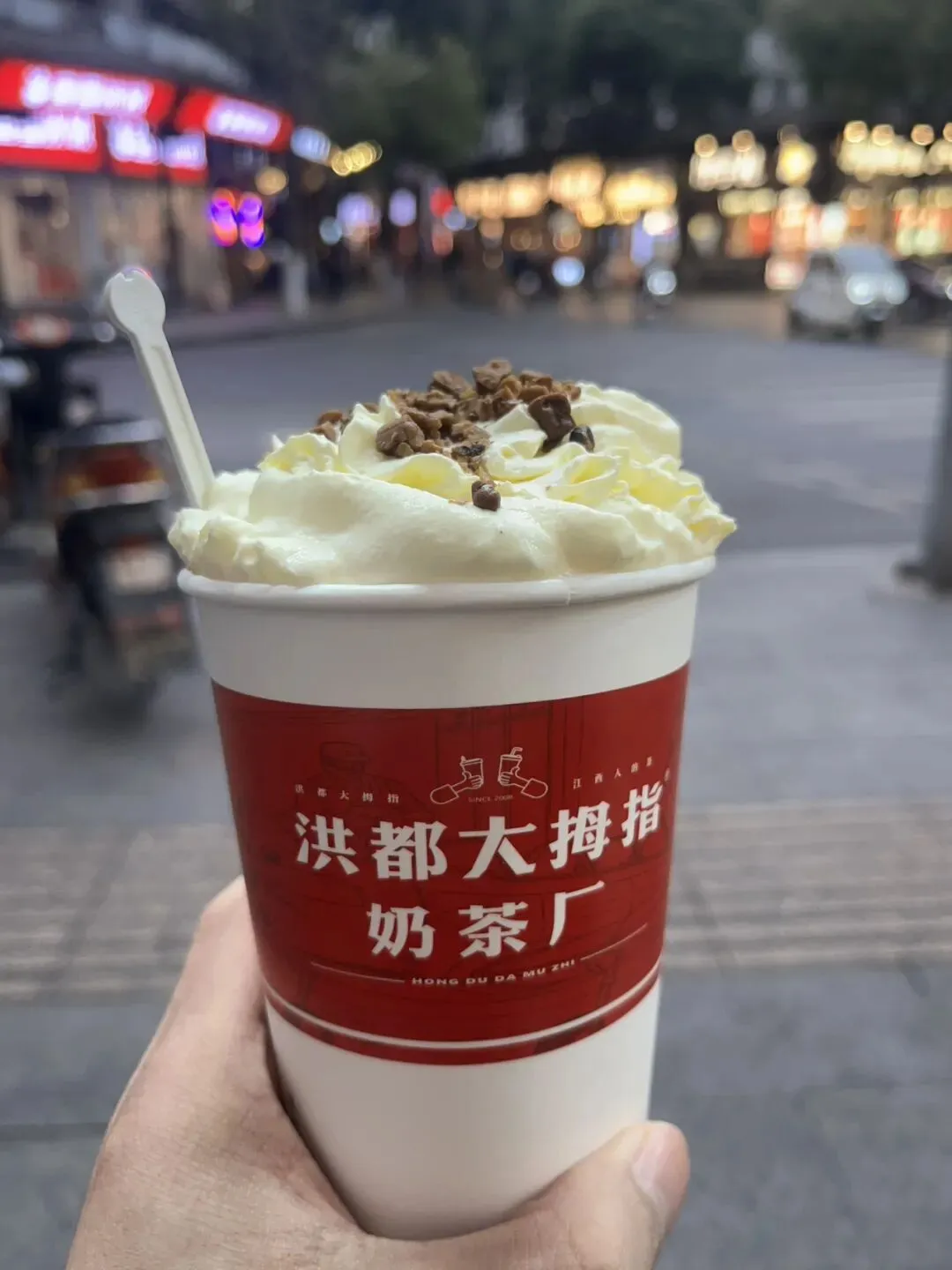 在回青旅的路上喝了一杯洪都大拇指招牌雪顶幽兰,应是当地排名第一的奶茶,甚至对面的蜜雪冰城门可罗雀,而他这里人流攒动,值得推荐的还有他家的烤肠蘸点辣椒粉味道真是绝了,特别美味。此时的雨下得愈发密集了,我躲在奶茶店的屋檐下避雨,一口奶茶一口烤肠也是好起来了。