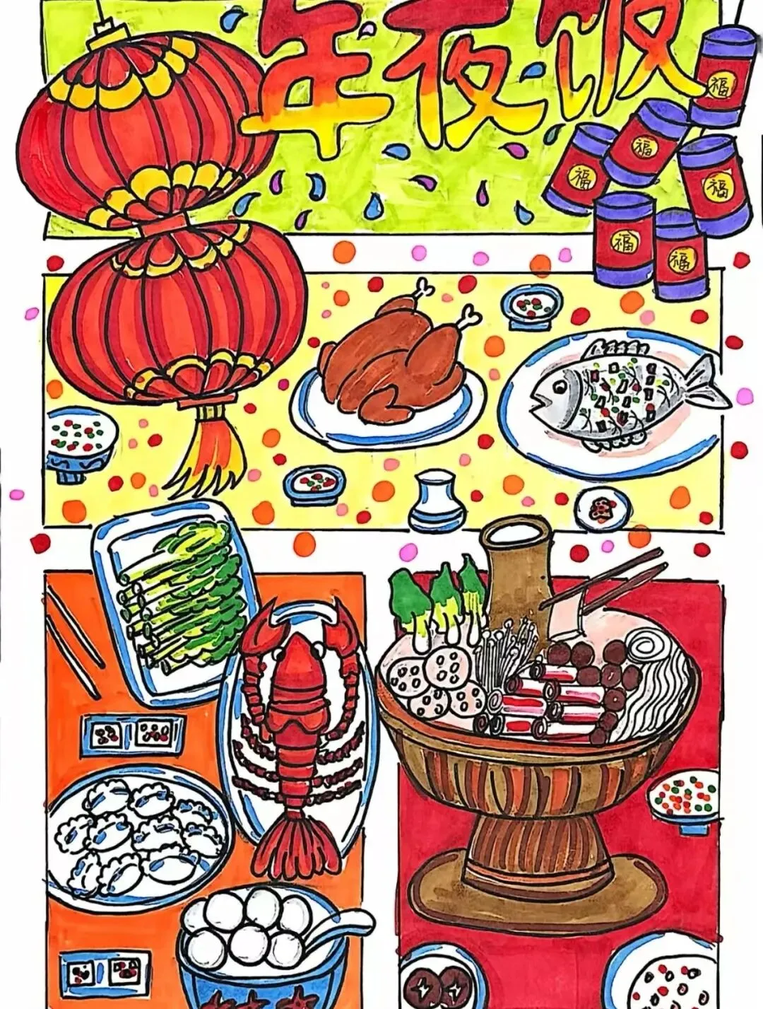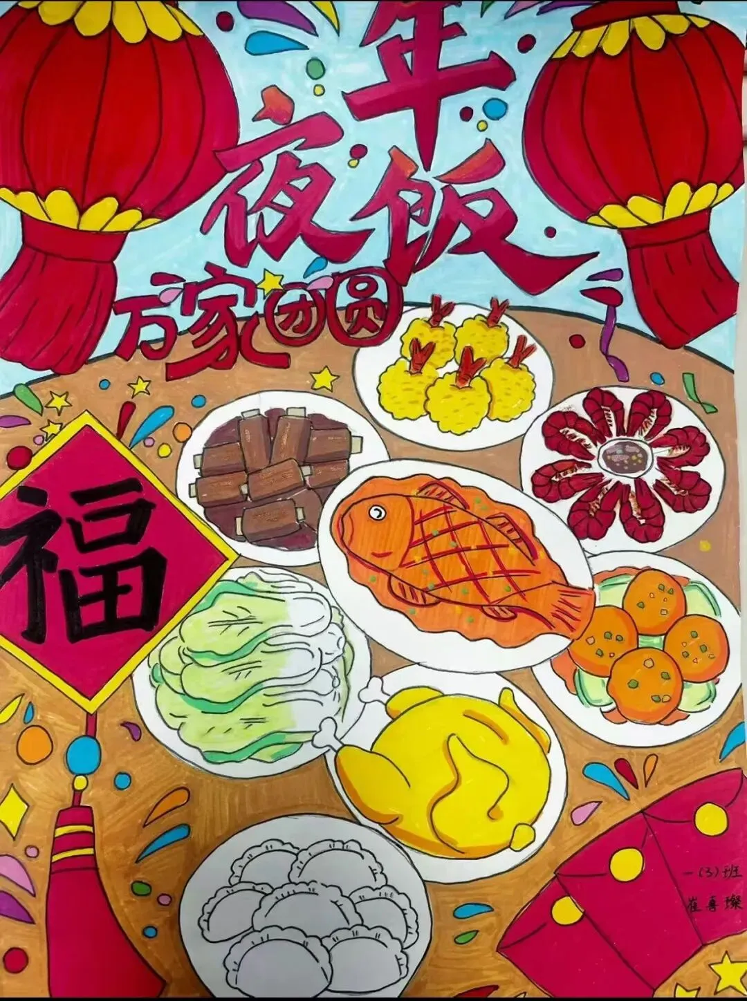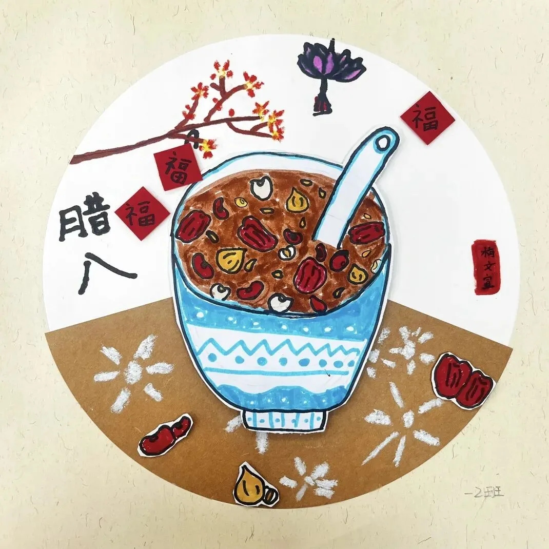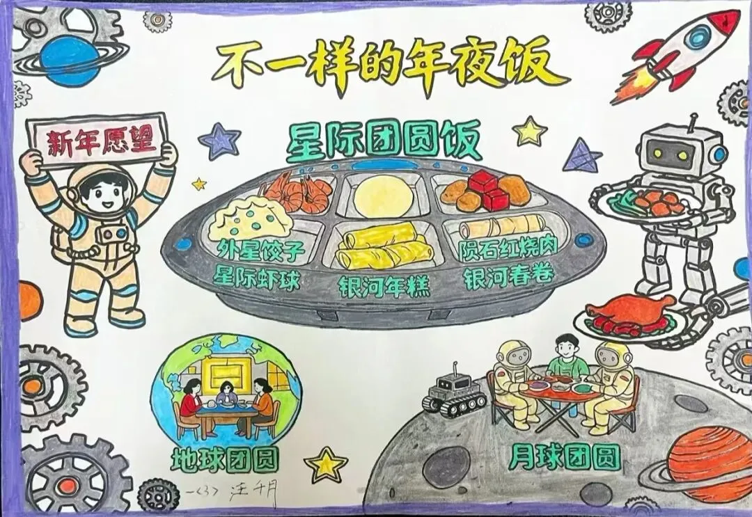 同学们利用身边的综合材料,画出了它们的“样子” 。不管是彩铅勾勒的细节,还是水彩涂出的热闹,每一幅画都散发着浓浓的烟火气。他们把年夜饭里藏着的团圆秘密,用艺术这把神奇的钥匙,永远定格在了作品里。