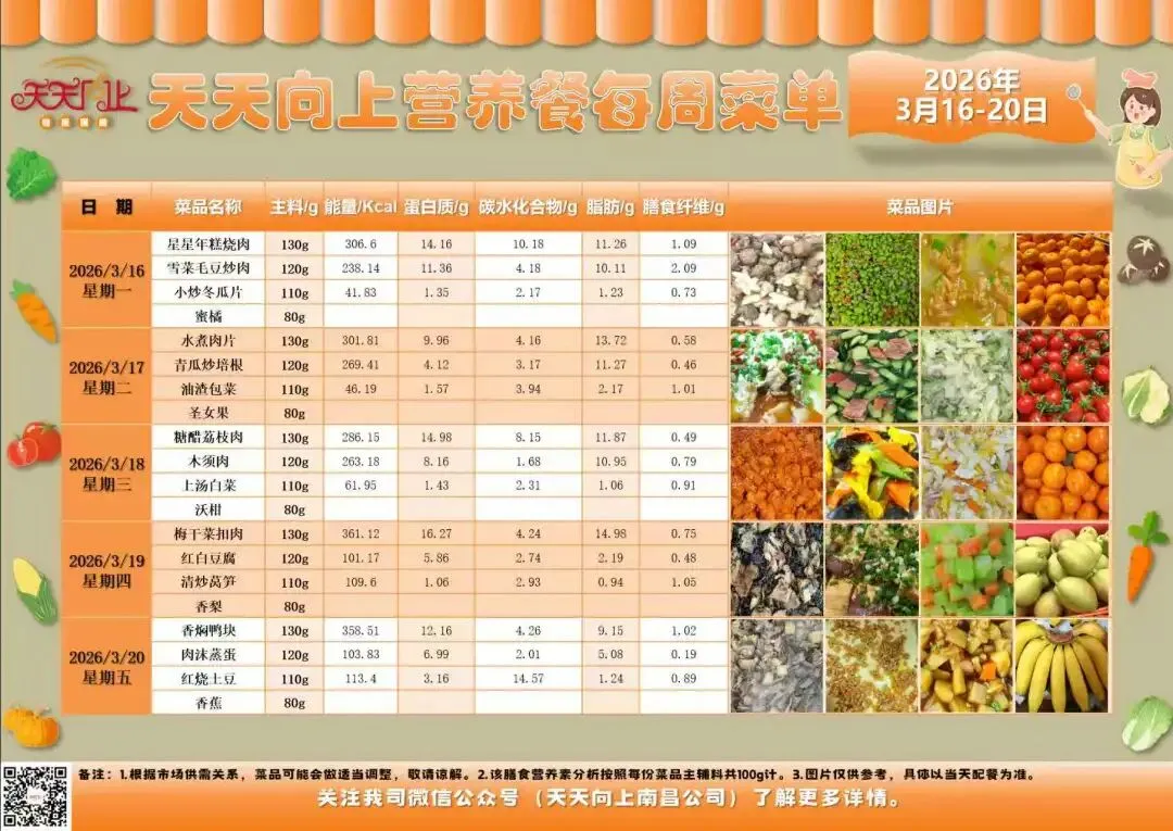 根据《南昌市中小学(幼儿园)配送餐管理办法》和相关精神,现将本校2026年3月16日—2026年3月20日菜谱公示如下: