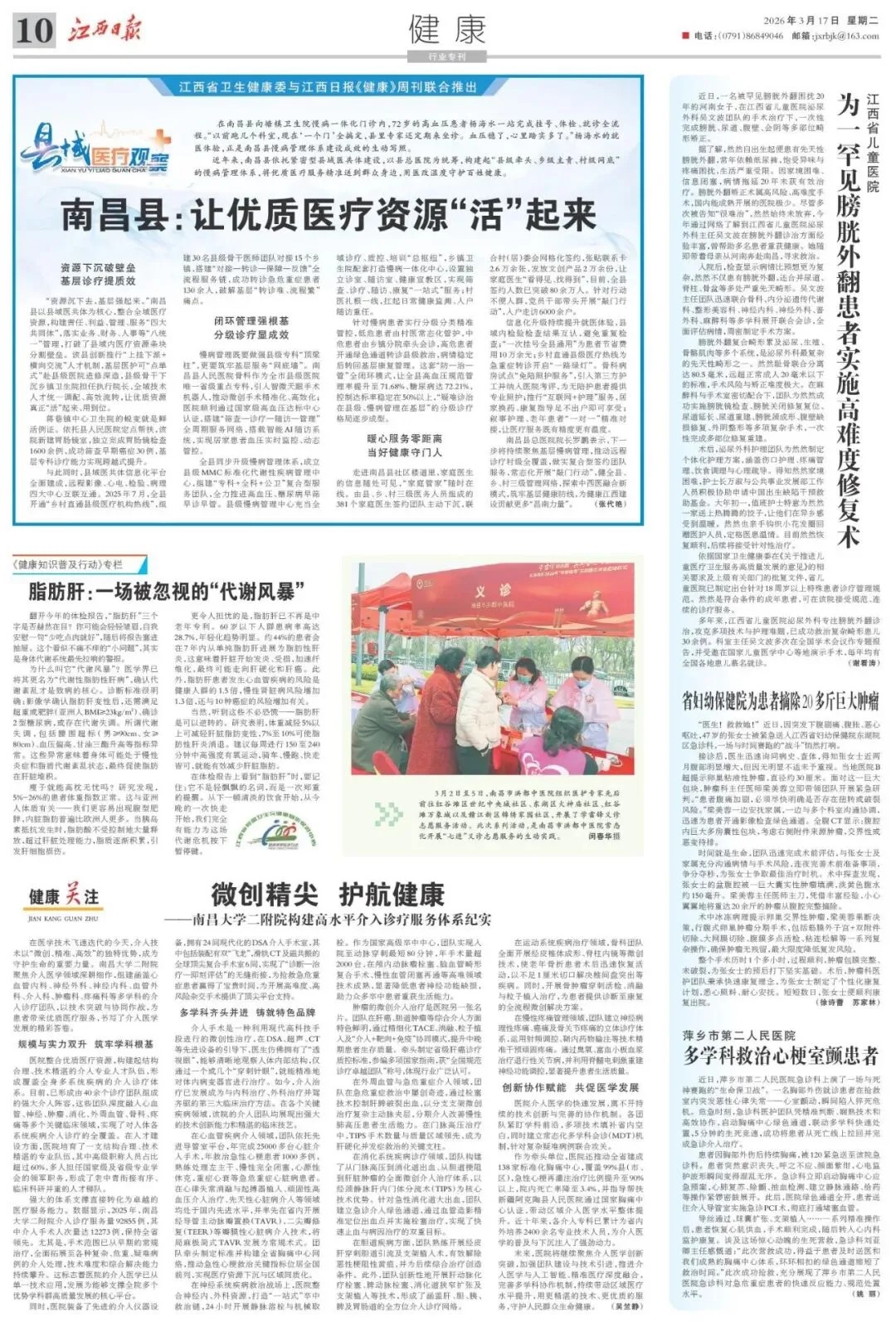 在南昌县向塘镇卫生院慢病一体化门诊内,72岁的高血压患者杨海水一站完成挂号、体检、就诊全流程。“以前跑几个科室,现在‘一个门’全搞定,县里专家还定期来坐诊。血压稳了,心里踏实多了。”杨海水的就医体验,正是南昌县慢病管理体系建设成效的生动写照。 近年来,南昌县依托紧密型县域医共体建设,以县总医院为统筹,构建起“县级牵头、乡级主责、村级网底”的慢病管理体系,将优质医疗服务精准送到群众身边,用医改温度守护百姓健康。