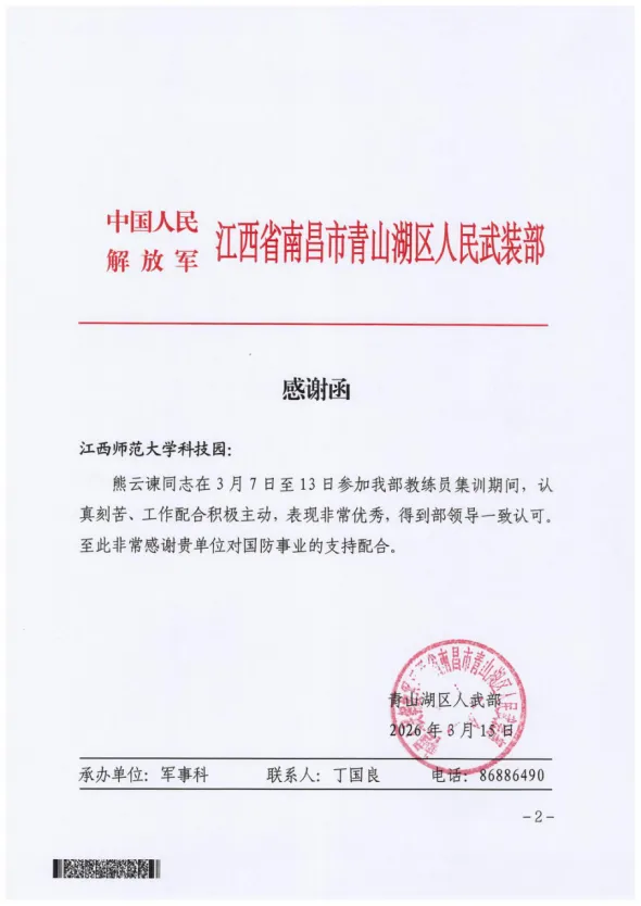 近日,南昌市青山湖区人民武装部给科技园发来感谢函,对科技园积极配合完成年度民兵教练员集训任务表示感谢,并对园区员工熊云谏同志在集训期间的突出表现予以肯定。