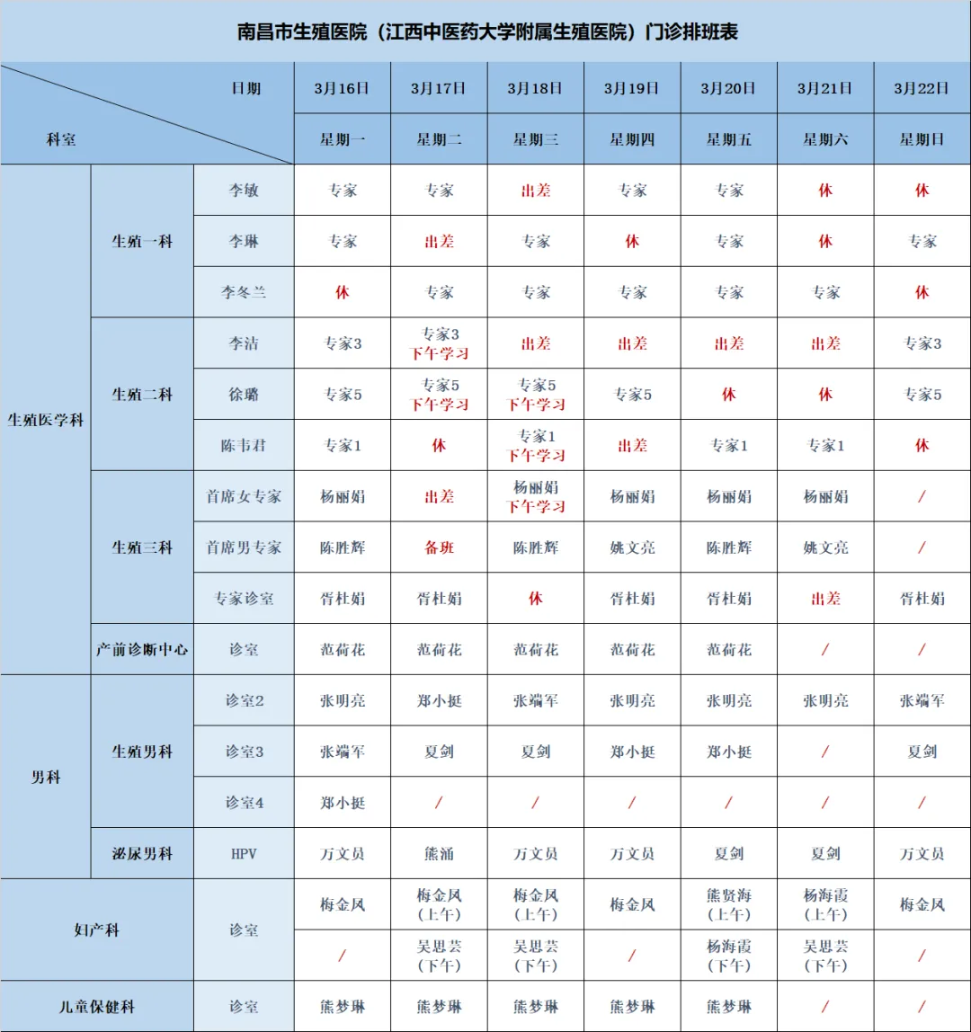 【出诊信息通知】南昌市生殖医院门诊医生排班表 (3月16日~3月22日门诊排班)