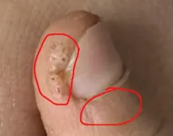 ♢指甲变形:如果疣体长在甲根(指甲半月板附近)或甲床下,会挤压甲板,导致指甲出现沟状凹陷、增厚、松动,甚至与甲床分离。