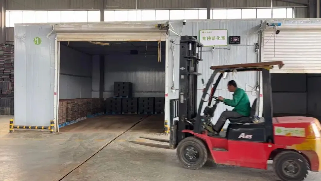在育秧暗化室内,温控、湿控设备全天候运行,为稻种发芽提供适宜环境。工作人员通过叉车转运育秧盘,配合机械流水线作业,全程规范有序、衔接顺畅。相较于传统育秧,机械化育秧不受天气影响,能提前培育壮秧,抢抓农时,为后续插秧、田间管理赢得主动,有效应对春季多变气候带来的种植风险。
