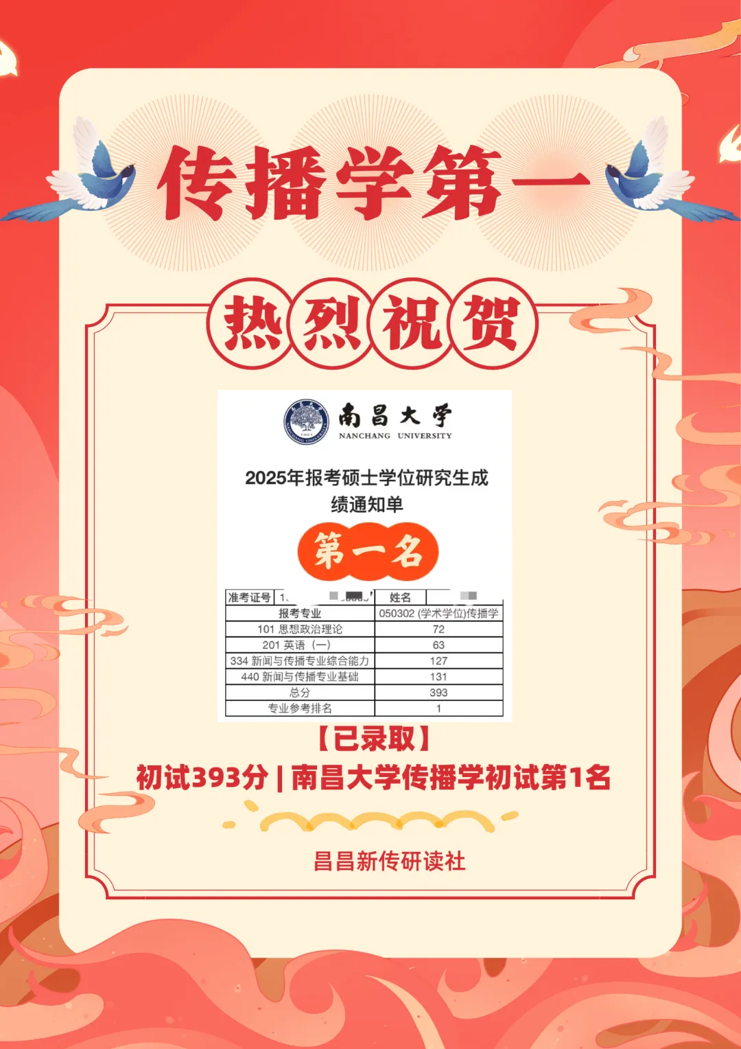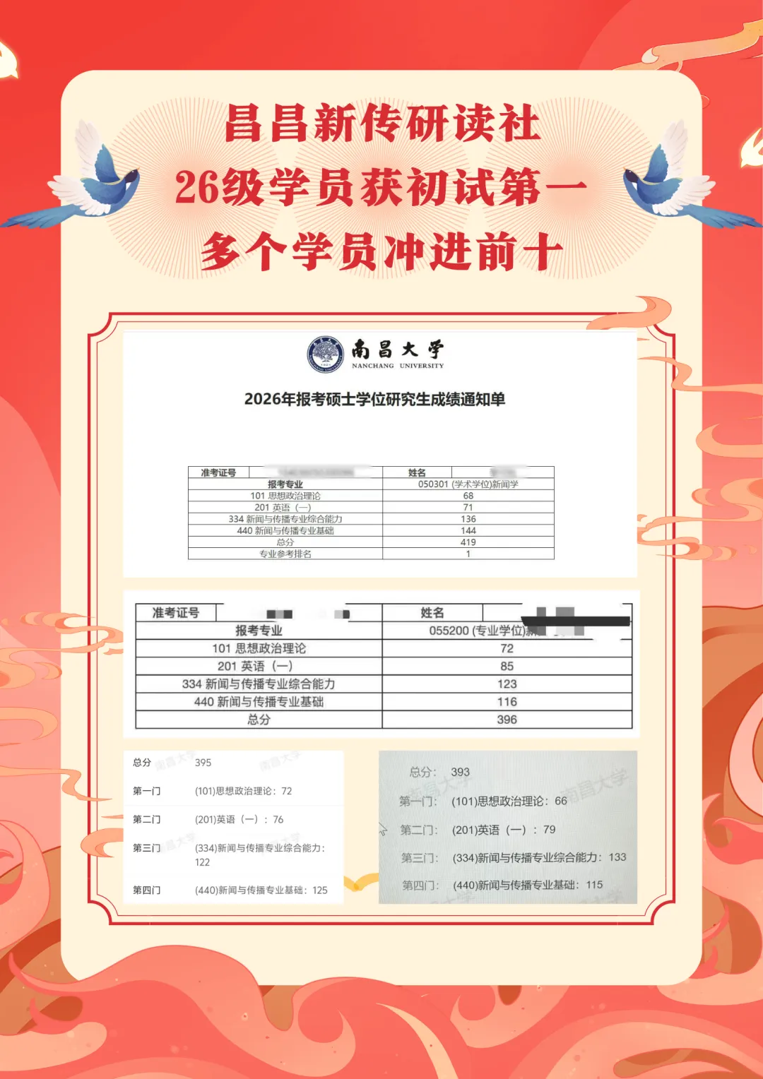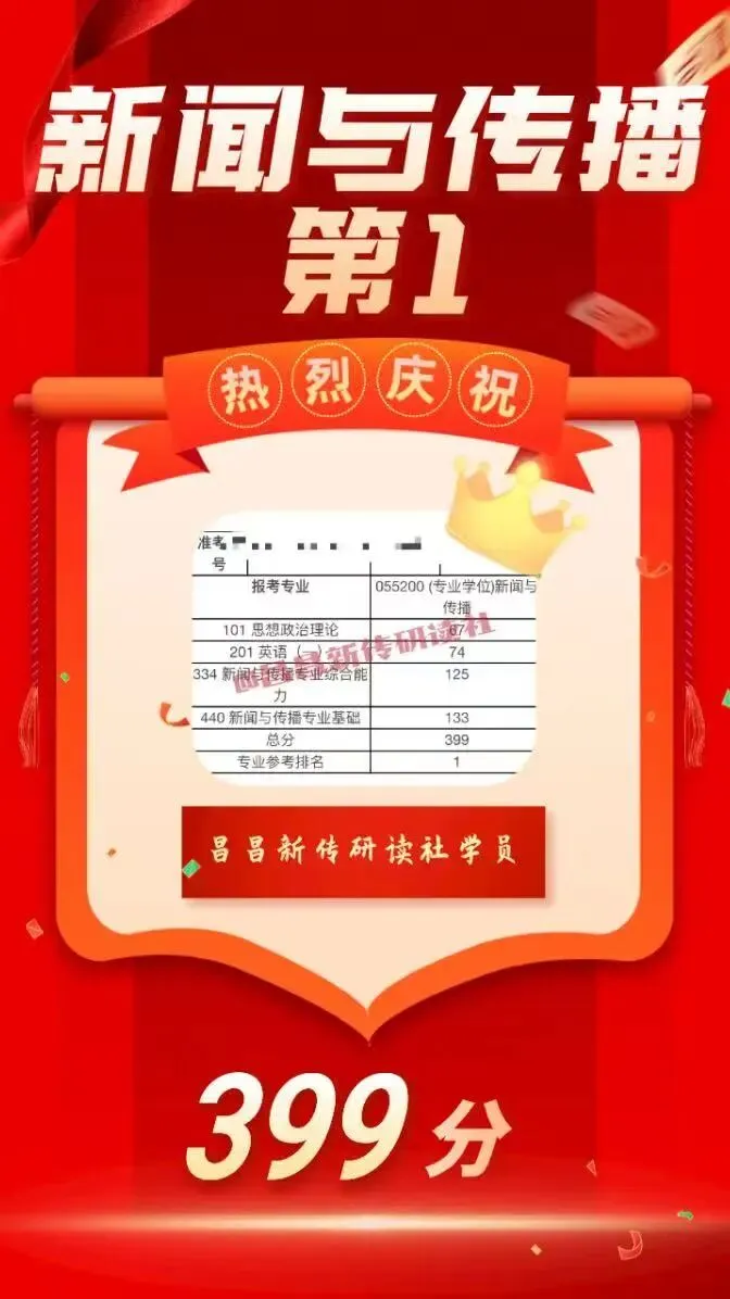 共18位同学被南昌大学第一志愿录取,包揽新闻学初试第一398分、传播学初试第一393分、新闻与传播初试第三397分!