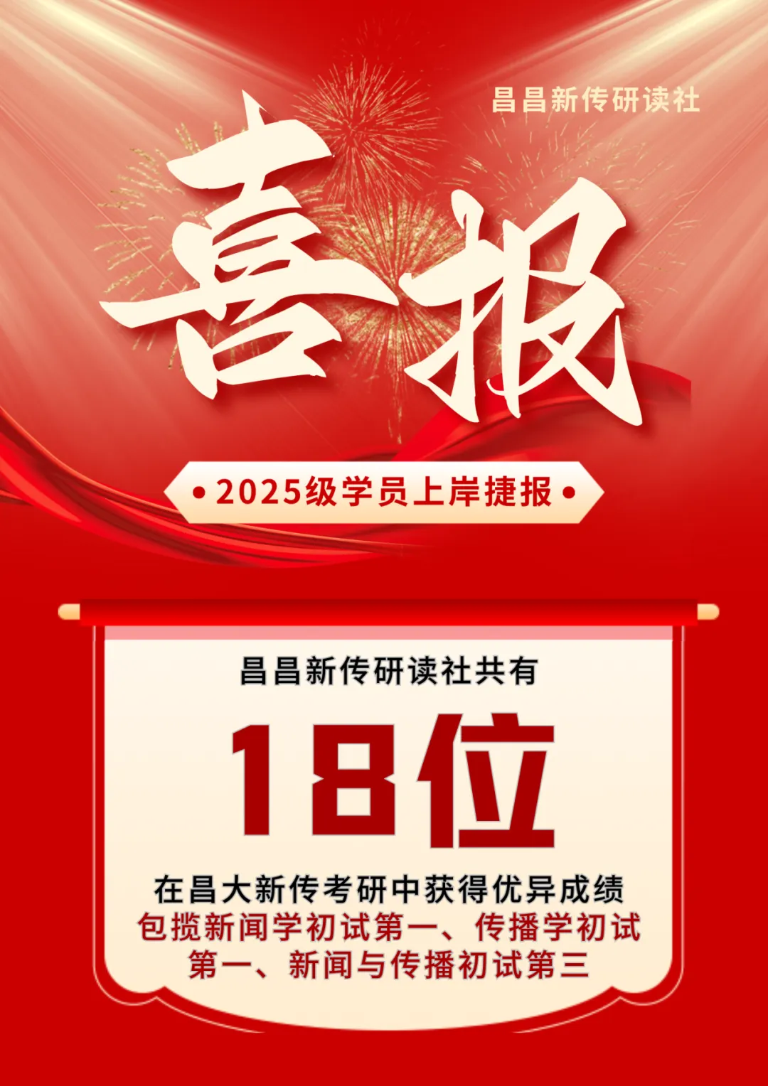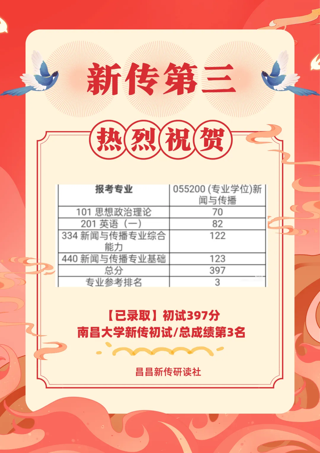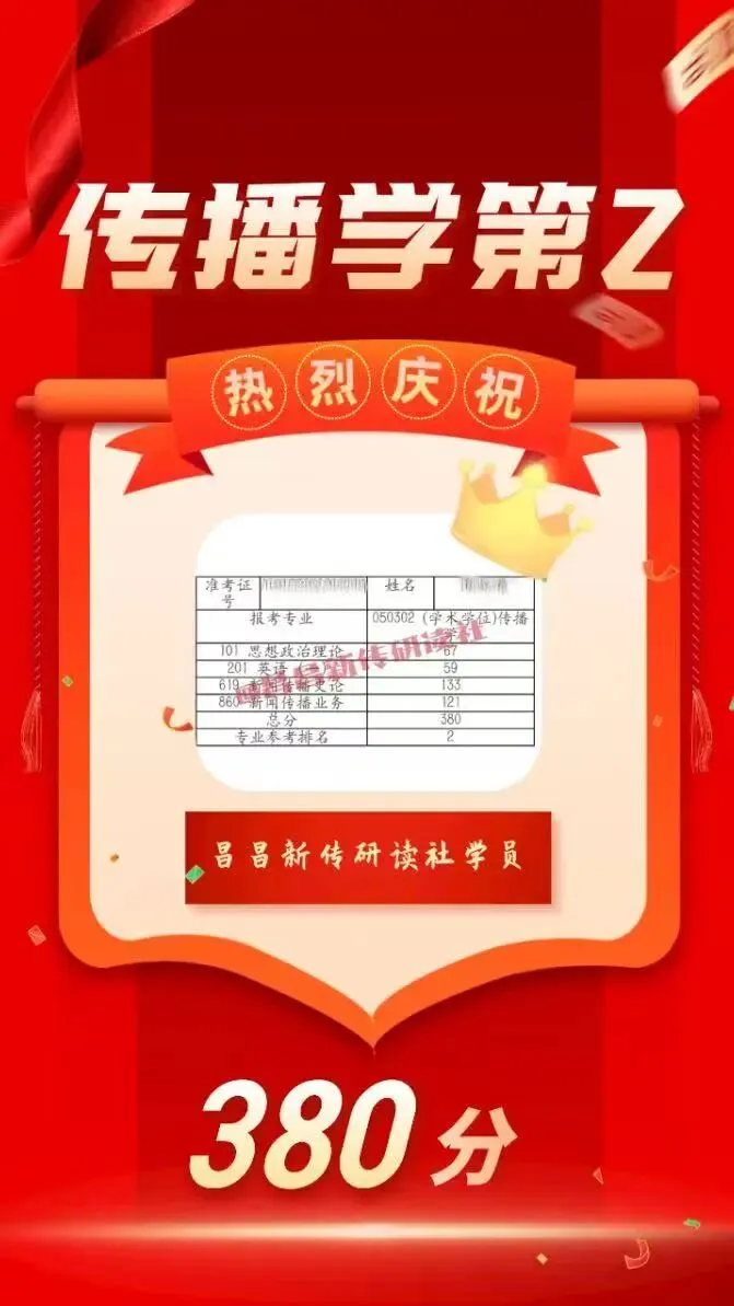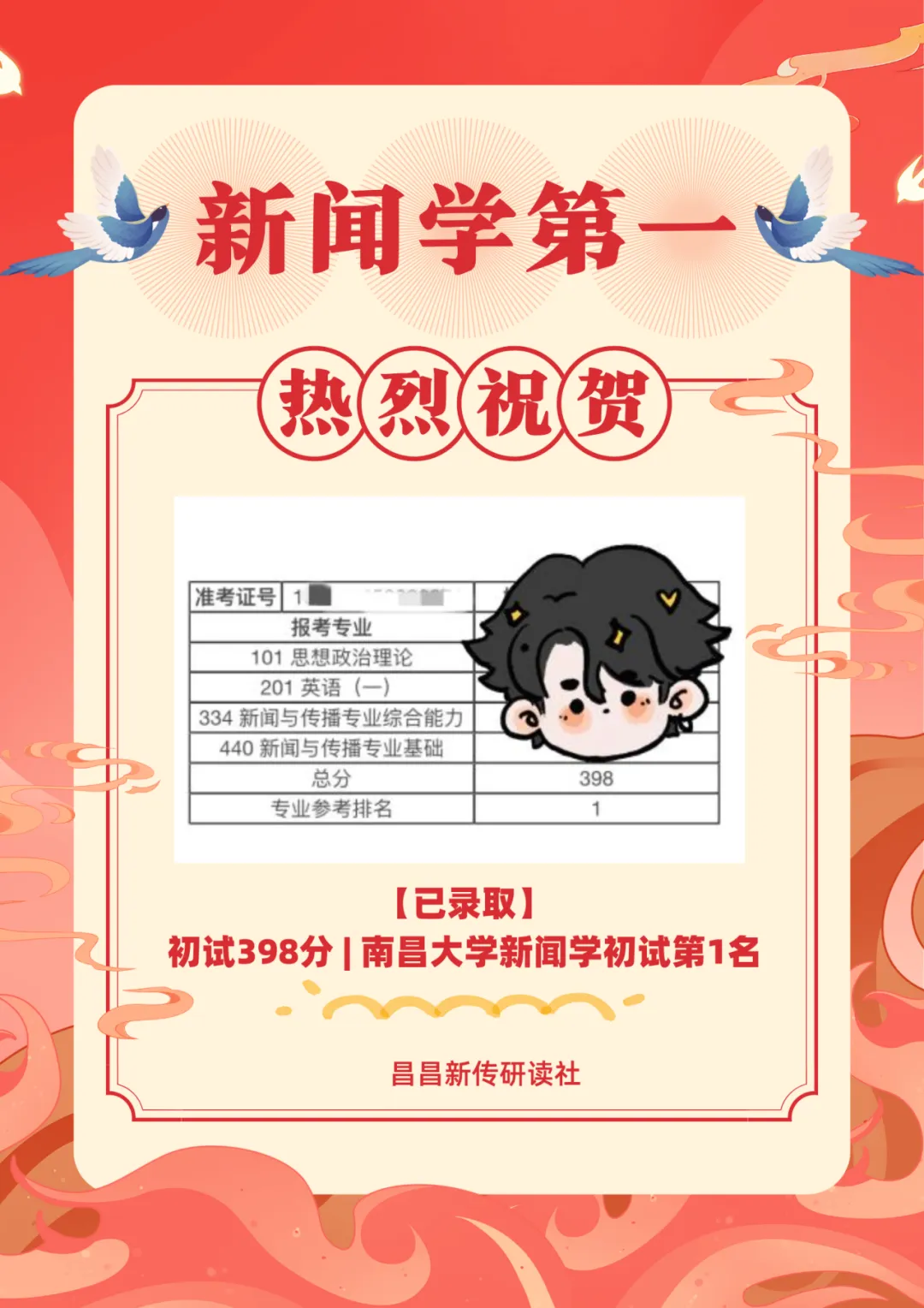 共18位同学被南昌大学第一志愿录取,包揽新闻学初试第一398分、传播学初试第一393分、新闻与传播初试第三397分!