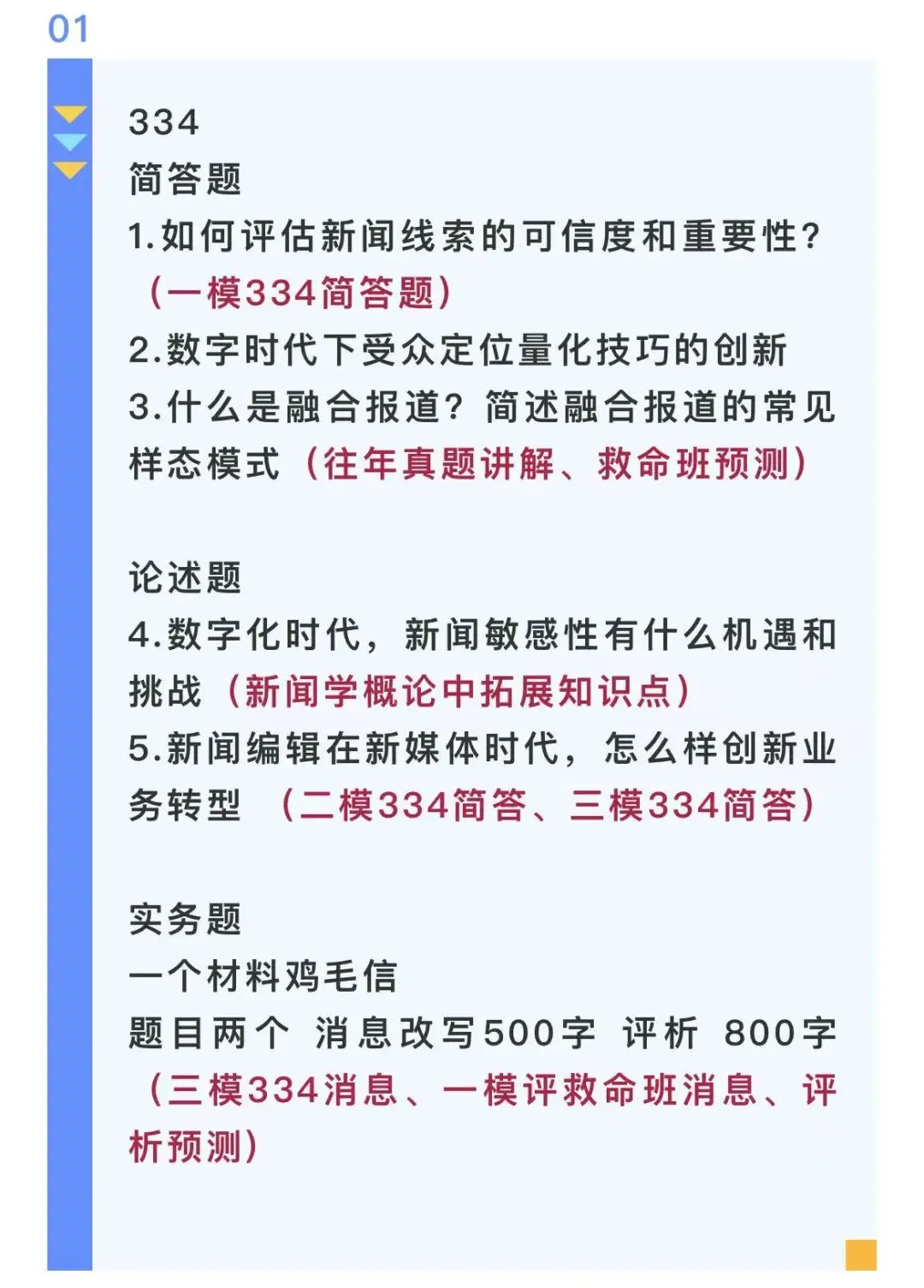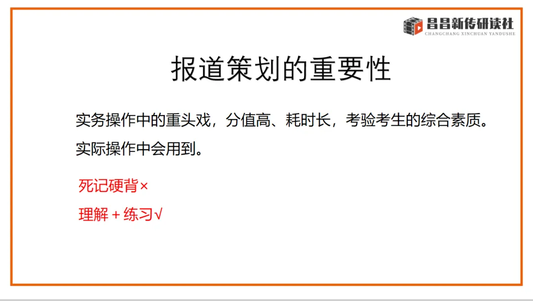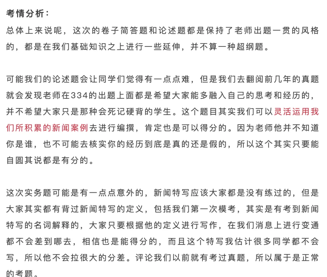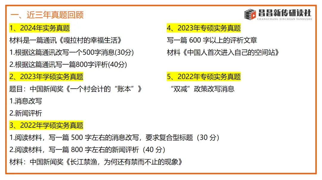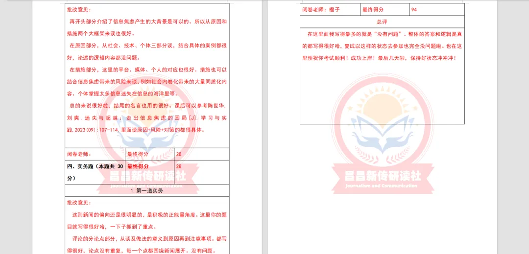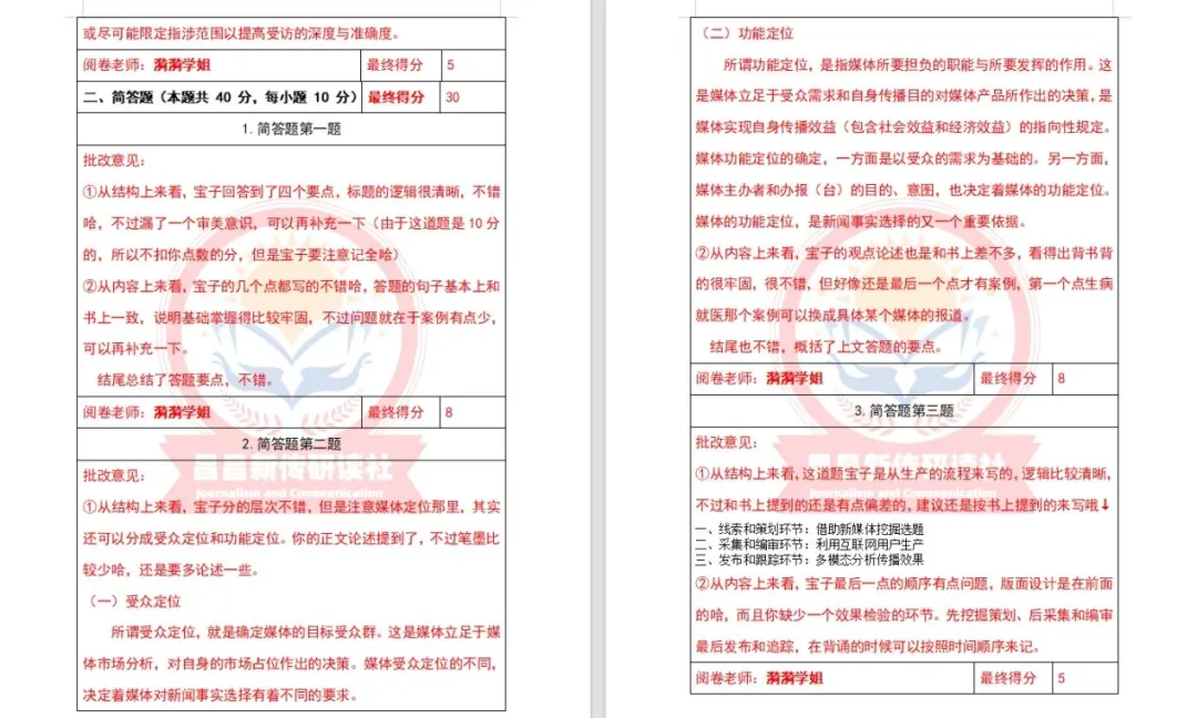 实务的考察几乎每年都会占到40-50分,作为新传考研实务的一大难点,容易拉开差距。研读社的授课老师将近几年的实务常考类型做归类总结讲解,批改老师都有丰富的实务批改经验,会一对一帮助大家找到实务问题并解决问题。大家只要按照学校考察的方向进行针对性的备考和训练,一定可以稳稳拿高分!