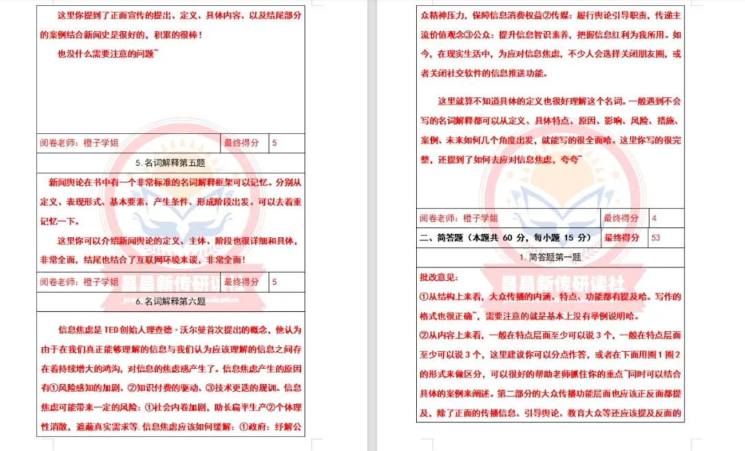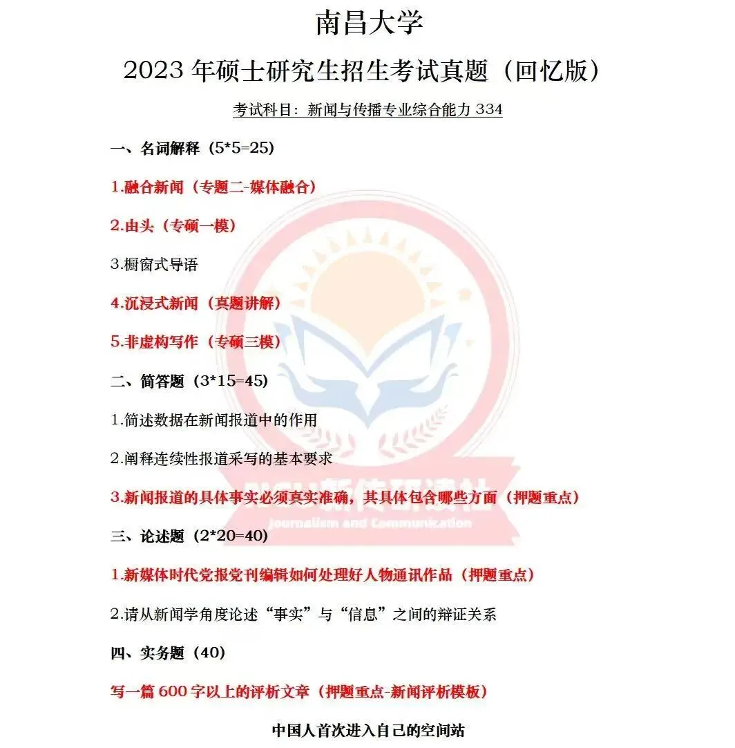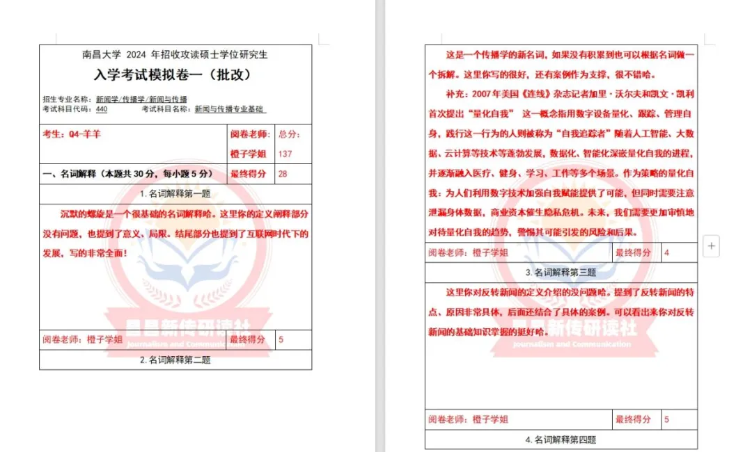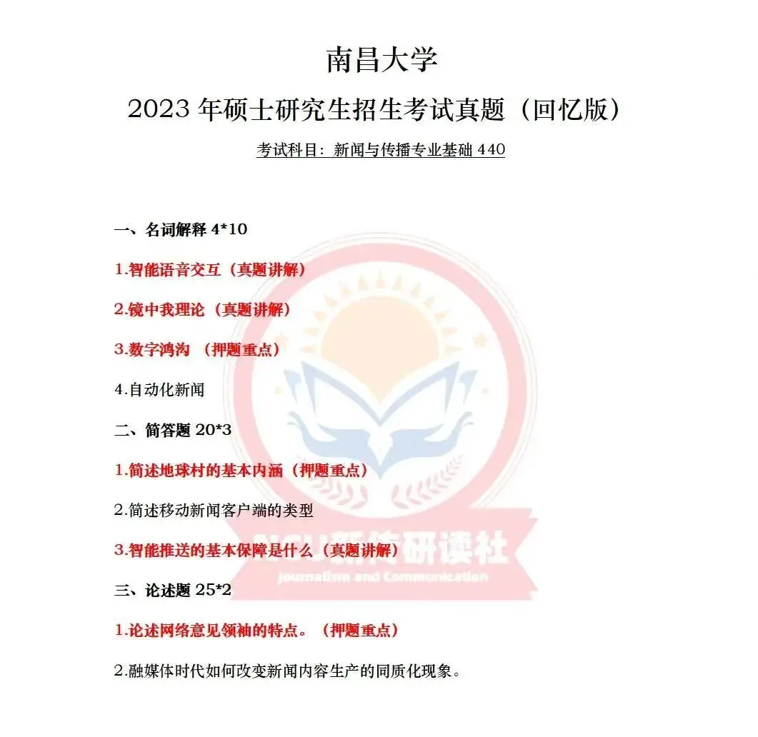 模拟考试是昌昌新传研读社自22年起一直有并且将长期保持的栏目,本社举行全真模拟三次考试,一是让学员们提前感受考场氛围,二是模拟出题是由高分上岸学长学姐结合真题趋势、学院导师论文、研究方向以及当年热点组成。