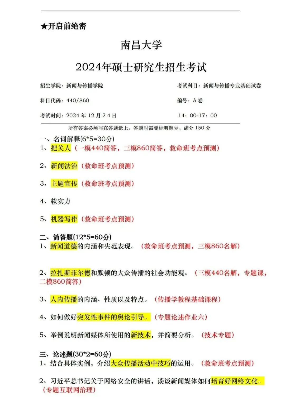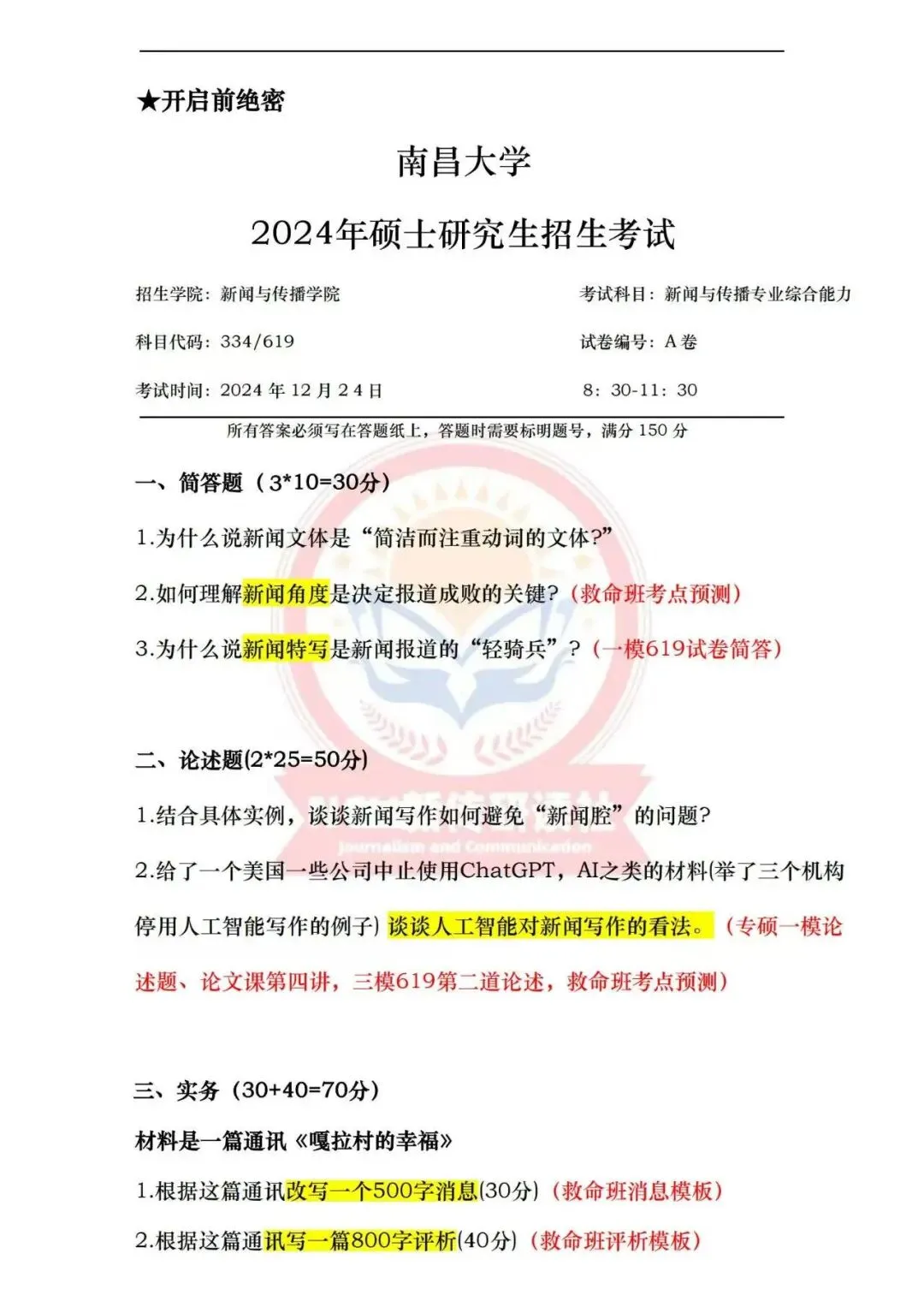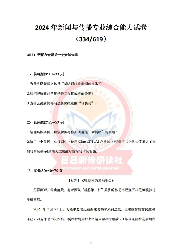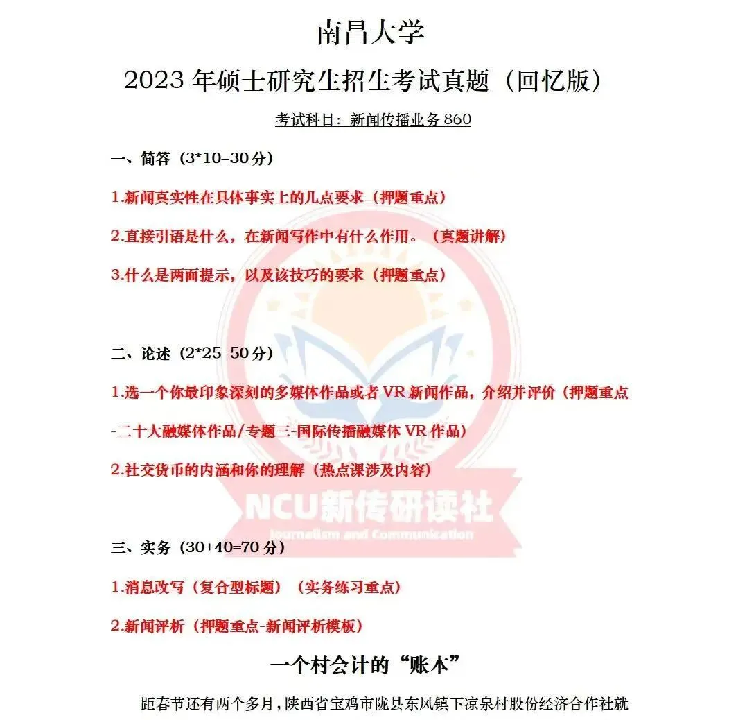模拟考试是昌昌新传研读社自22年起一直有并且将长期保持的栏目,本社举行全真模拟三次考试,一是让学员们提前感受考场氛围,二是模拟出题是由高分上岸学长学姐结合真题趋势、学院导师论文、研究方向以及当年热点组成。