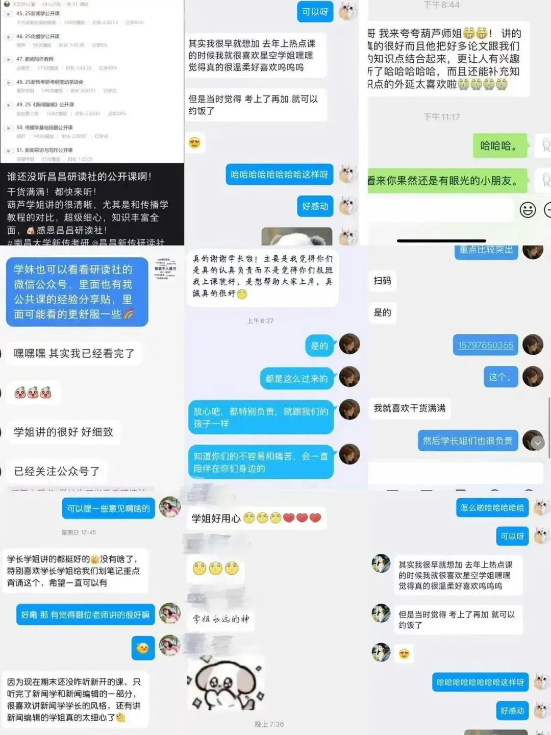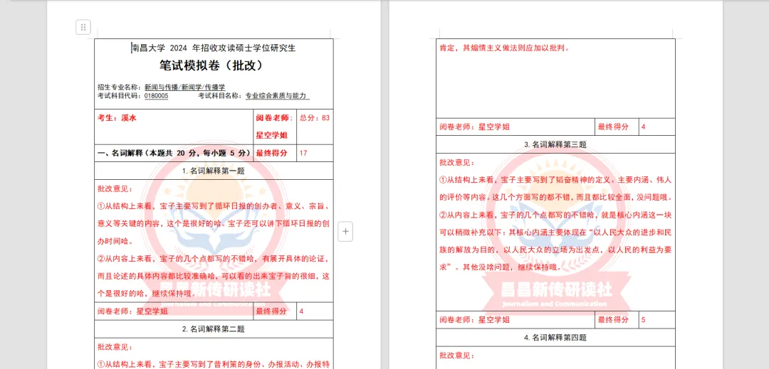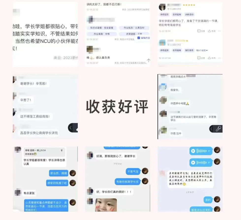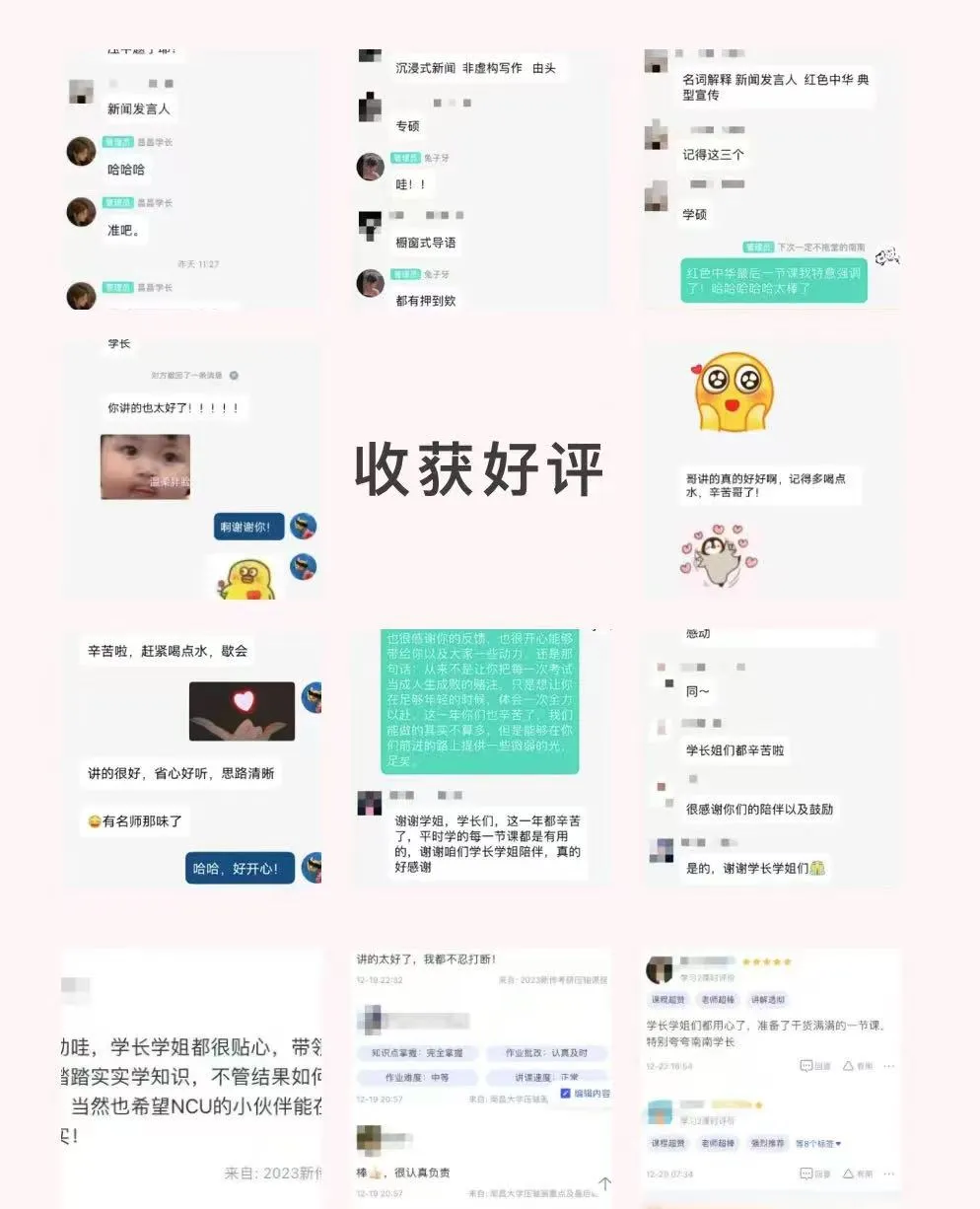 课程系统设置合理、全天候细致批改贴心答疑、实力团队辅导、好评一直不断……昌昌新传研读社专注南昌大学新传考研辅导,教务团队皆为高分上岸的直系学长学姐,专业扎实且熟知考研痛点,能为每位同学定制学习计划,精准辅导。且提供丰富资料,督学体系完善。多年来助力众多学子成功上岸。(下面为部分截图,后面还有展示!)