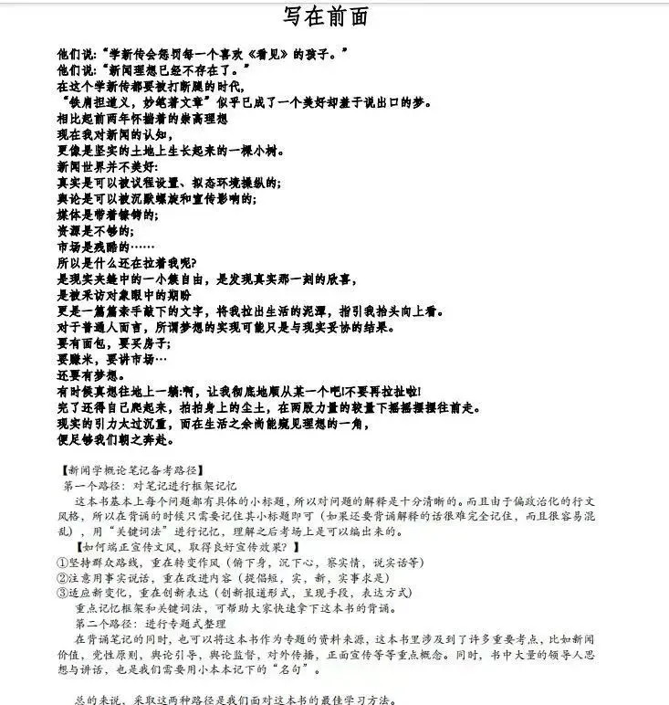 2027版笔记根据实际教学经验重新编订升级,更适合南昌大学新传考研形势,贴合最新命题趋势和规律。这些笔记非简单对参考书抄书式整理,而是包含了真题链接、拓展延伸、知识解析…部分笔记章节还针对南昌大学新传考研配备了真题回顾+考情分析+考点链接+知识表格。全程班资料体系主要包括基础参考书目纸质版笔记、专题强化答题纸质版笔记、真题解析纸质版笔记、模考解析纸质版笔记、高维语料纸质版笔记。