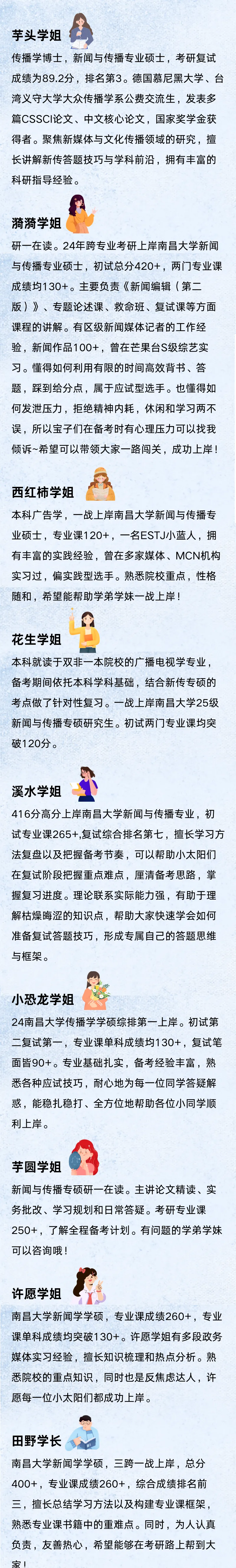 全程由南昌大学直系新传高分上岸学长学姐陪同,金牌团队打造金牌27全程班!本社高手云集,团队老师包揽近3年前三名、420+、400+上岸直系学长学姐。