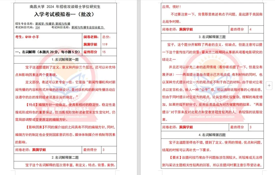 本社将近七年的真题一一剖析绘制成真题解析,也打造了专属真题纸质版笔记。真题笔记编辑者均为南昌大学新传考研上岸高分学长学姐,由他们阐述解题逻辑,更加具备针对性,有南昌大学院校独家特色。笔记中有真题、有答案参考,再添加编辑团队对一些答案“为什么好”、“还可以怎么答”的点拨,帮助更多人知其然、更知其所以然。