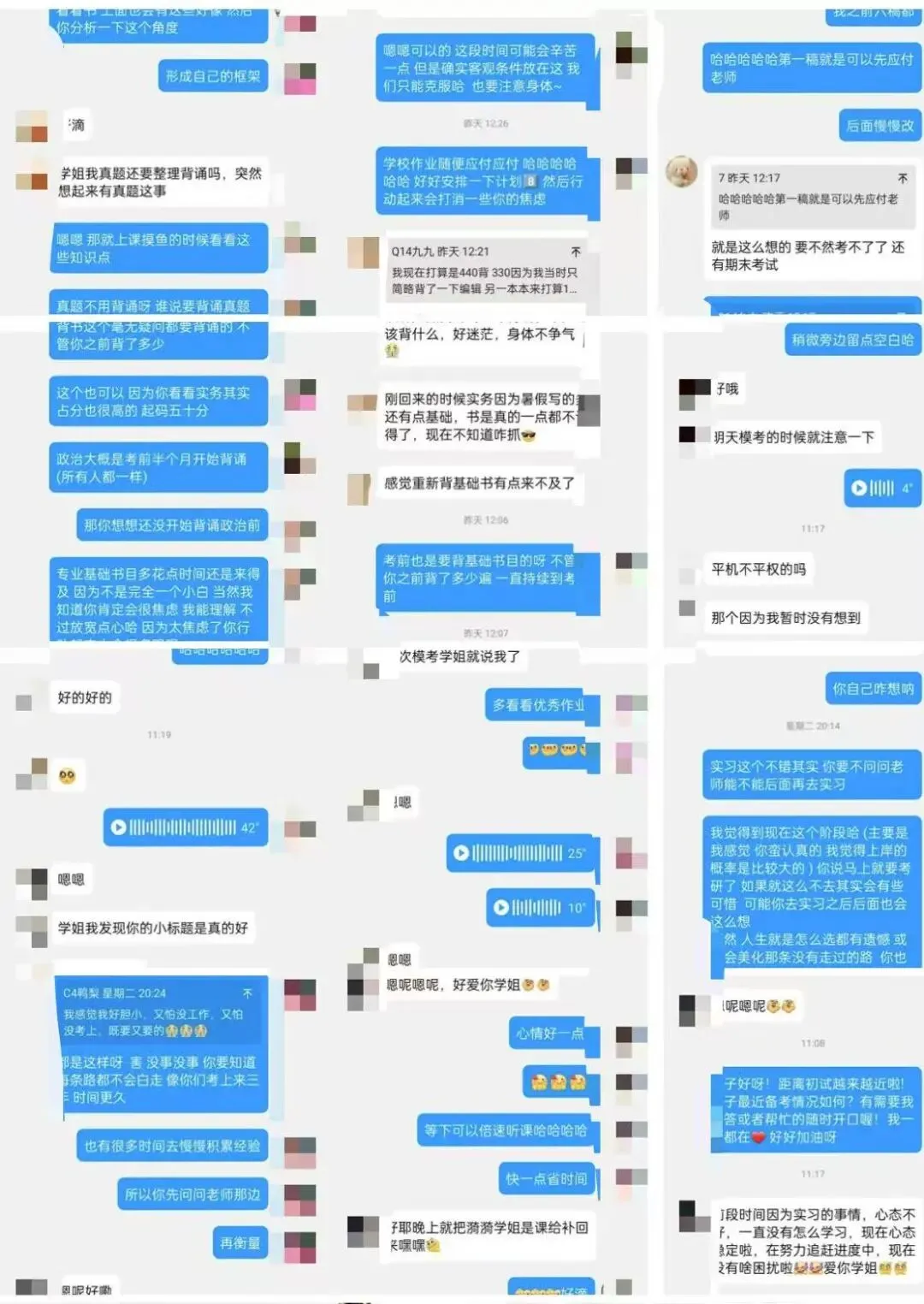 正式开课后,学长学姐们负责学员群各类课程通知、答疑解惑、分享热点文章、院校动态等;除了专业课知识的解答,学长学姐们更像是大家备考过程中的“心灵按摩师”,焦虑、担忧、各种情绪,都可以与学长学姐们分享。